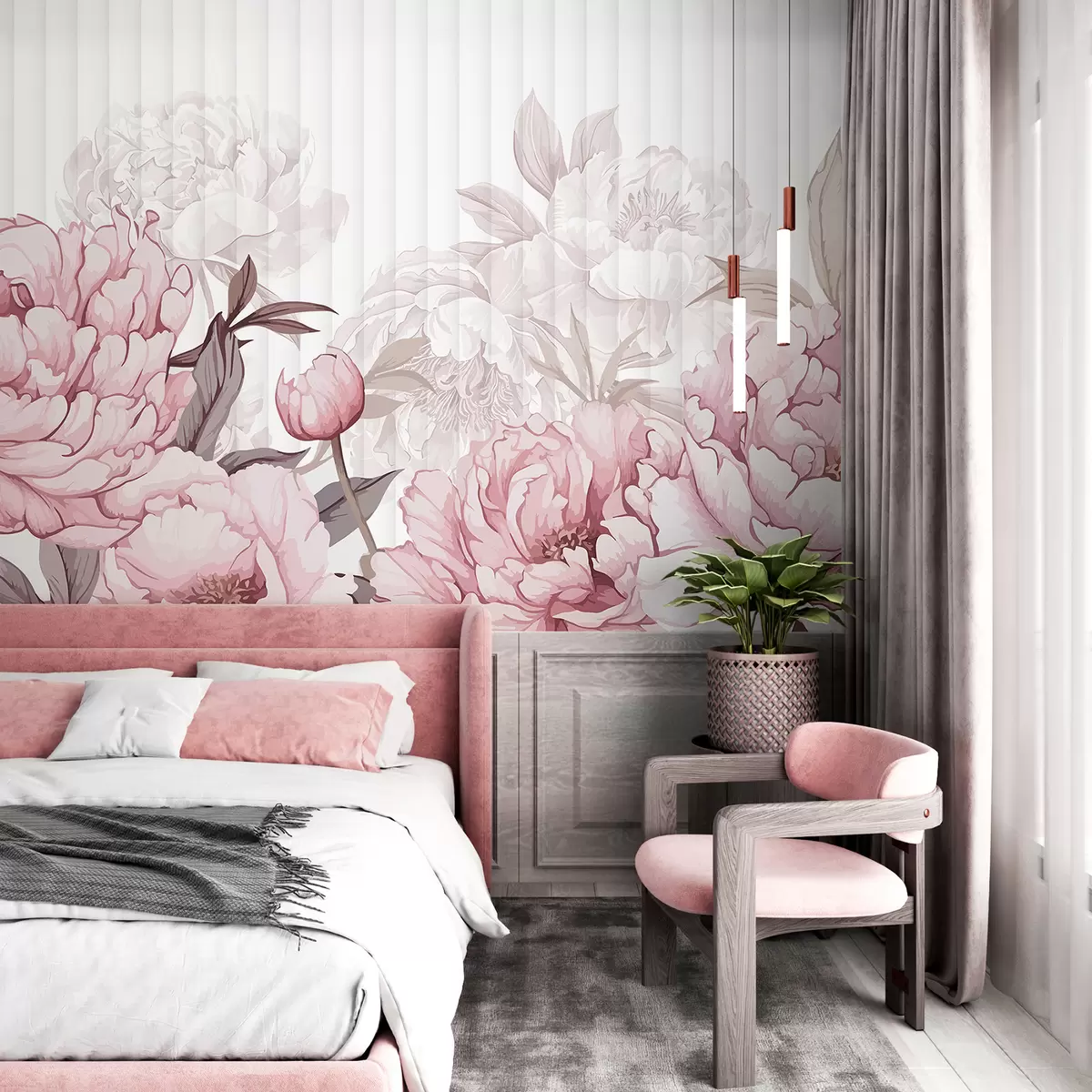Carta da parati Una vista ravvicinata di grandi e delicati fiori di peonia bianchi e rosa su uno sfondo morbido e strutturato nr. w08255