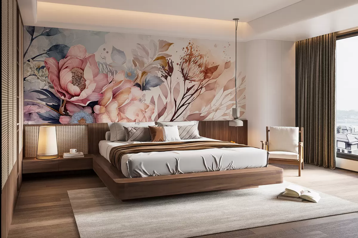 Carta da parati Grandi fiori rosa e blu con petali delicati, circondati da fiori più piccoli su uno sfondo acquerellato nr. w08256