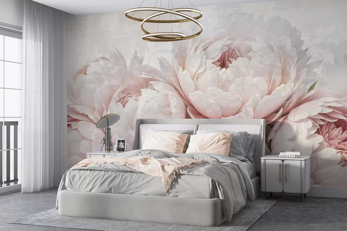Carta da parati Peonie rosa tenue con petali delicati su uno sfondo vintage dalla texture leggera nr. w08312