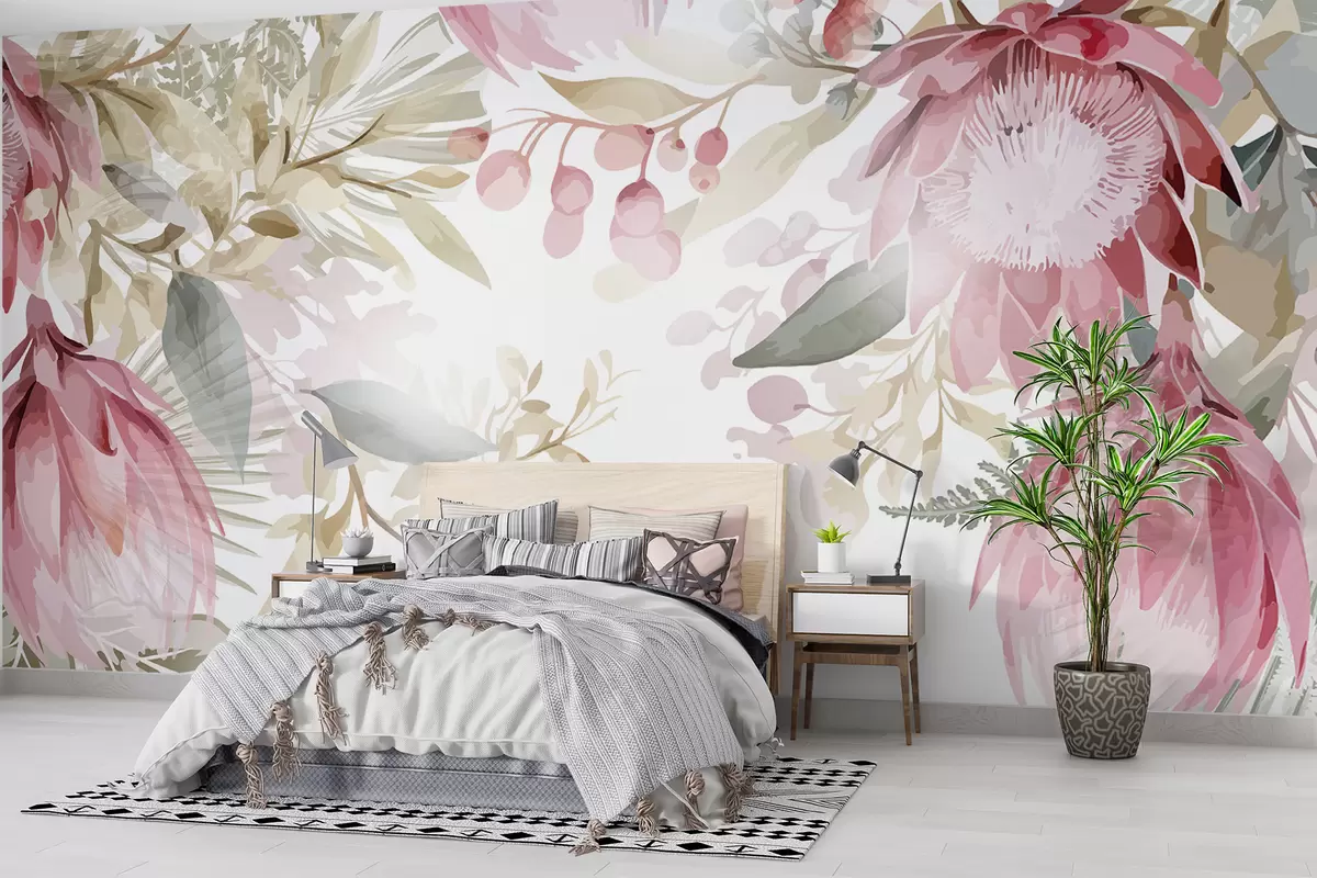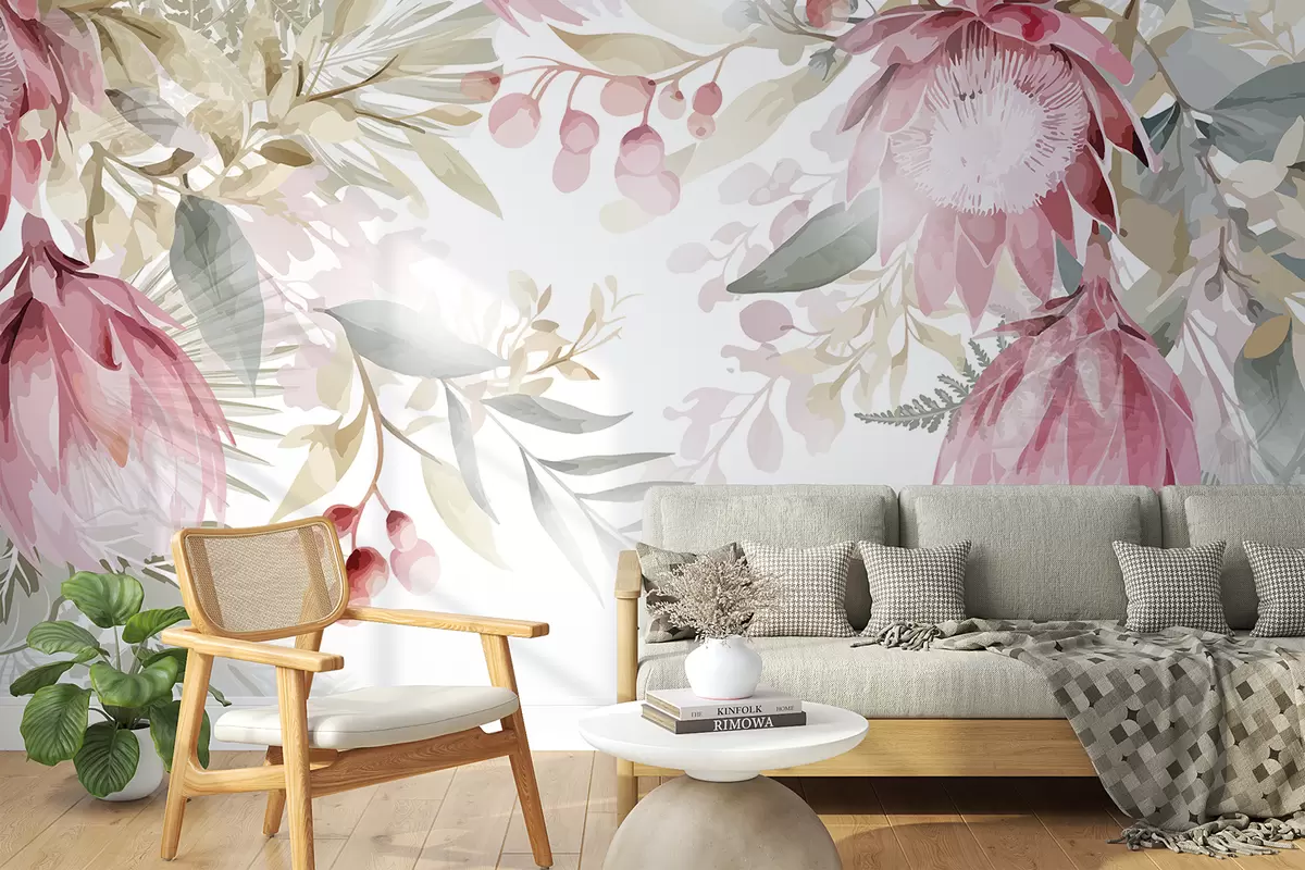 Carta da parati Grandi protee trasparenti bianche e rosa con foglie verdi e rigogliose su uno sfondo chiaro nr. w08315