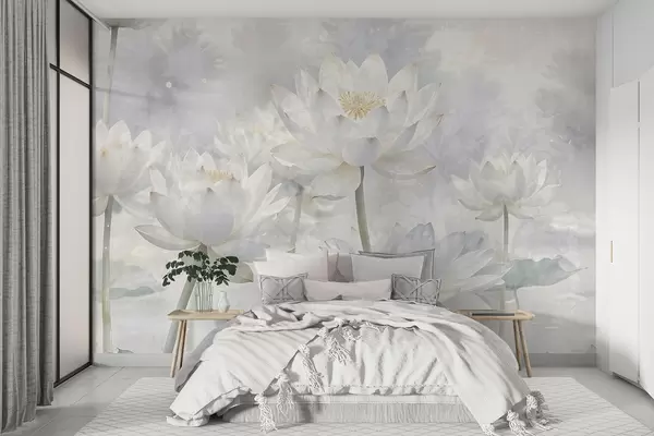 Carta da parati Fiori di loto bianchi in uno sfondo nebbioso ed etereo di paesaggio astratto pastello nr. w08328