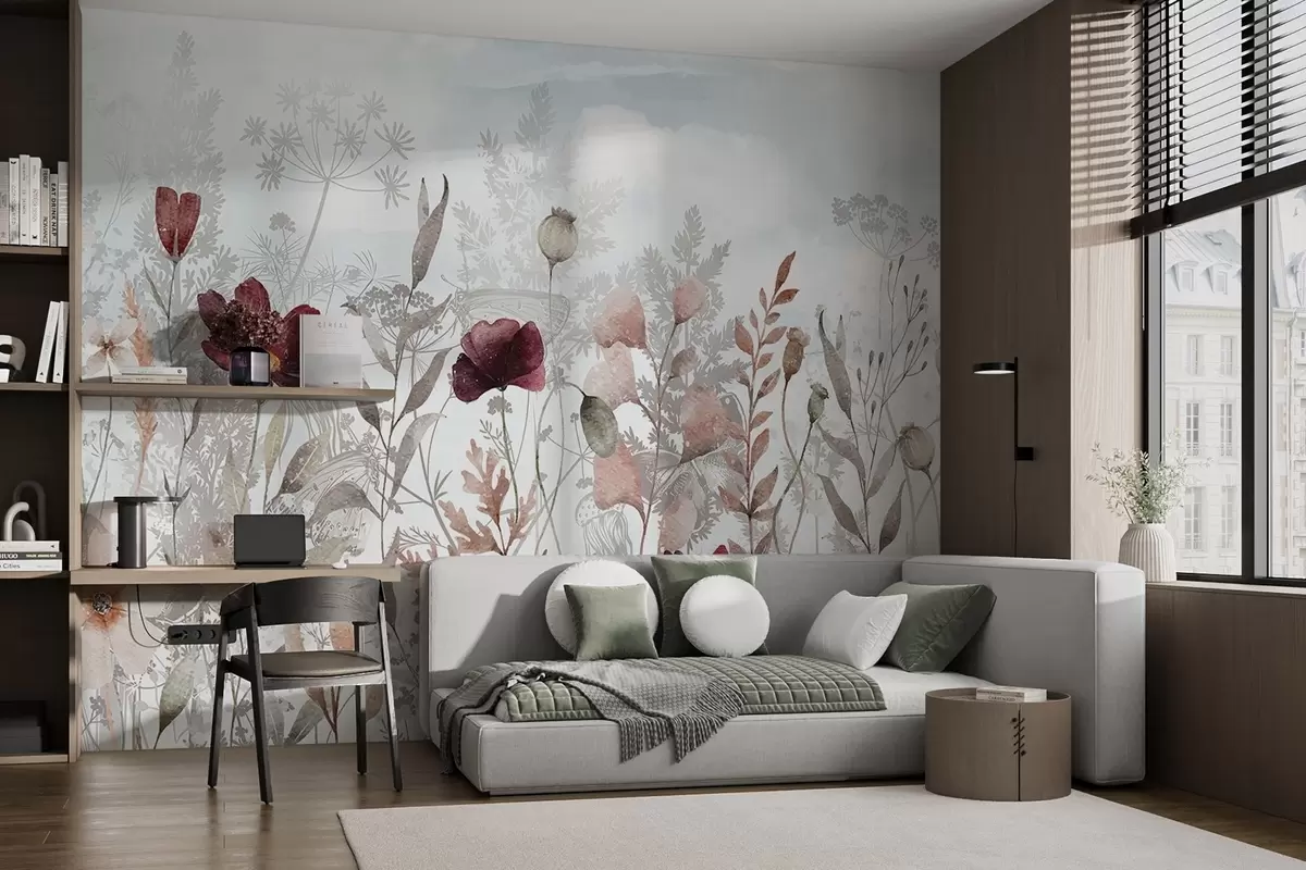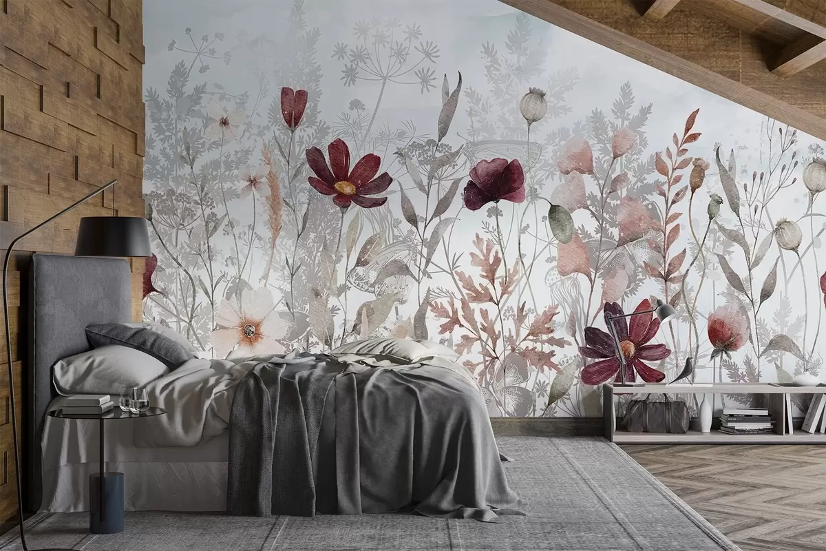 Carta da parati Un campo di fiori selvatici colorati, tra cui fioriture rosse, rosa e bianche con foglie ondulate su uno sfondo morbido nr. w08349