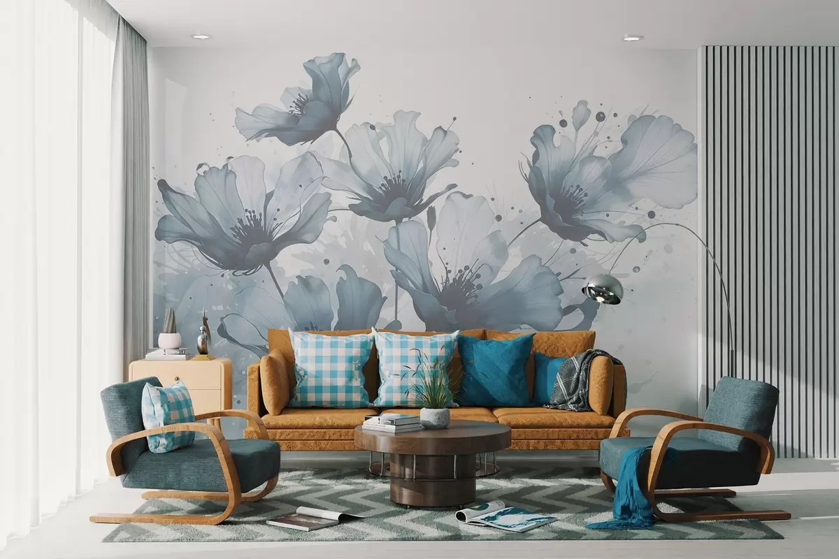 Carta da parati Delicati fiori blu con petali morbidi e sfocati e schizzi di acquerello su uno sfondo chiaro nr. w08376