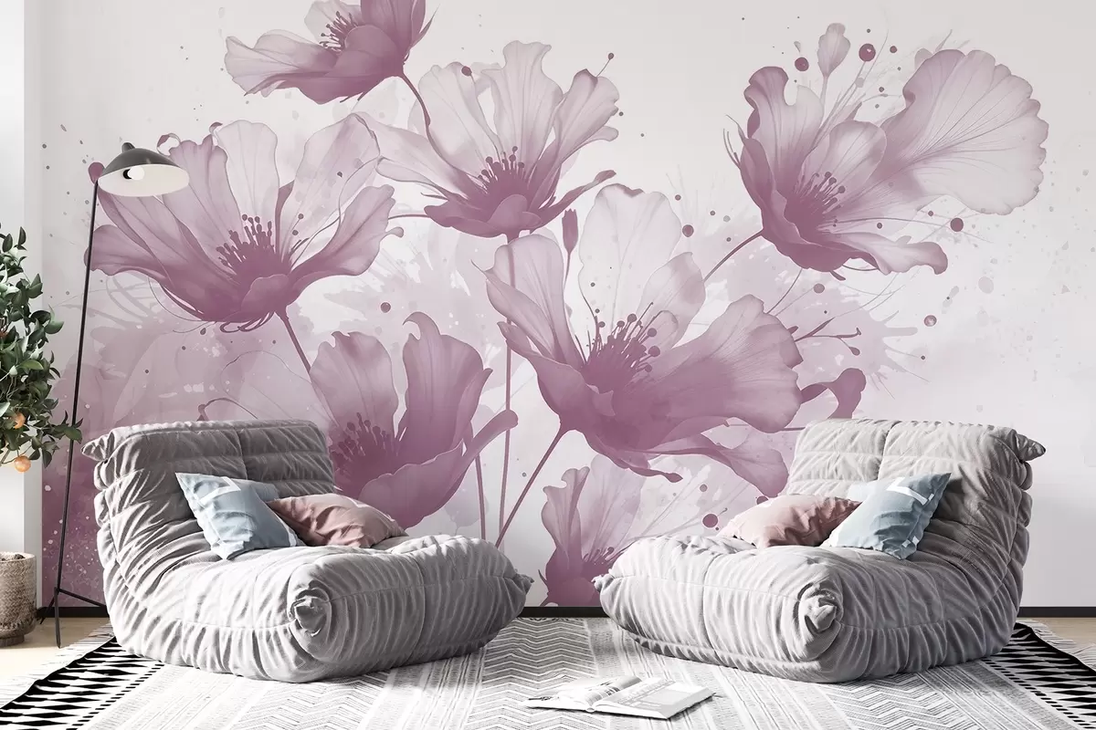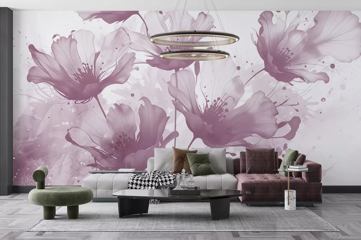 Carta da parati Delicati fiori rosa con petali morbidi e sfumati e schizzi di acquerello su uno sfondo chiaro nr. w08376v2