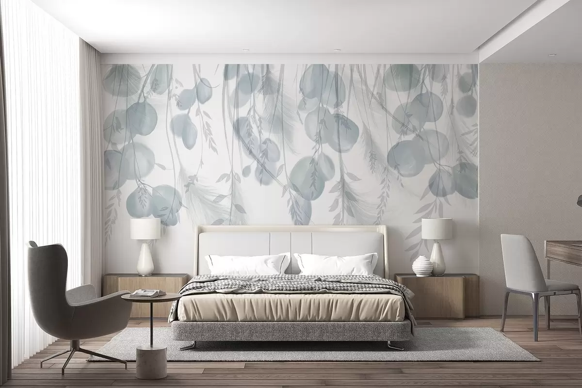 Carta da parati Delicate foglie di eucalipto grigie e verde pastello che cadono, creando un'atmosfera serena e rilassante nr. w08380
