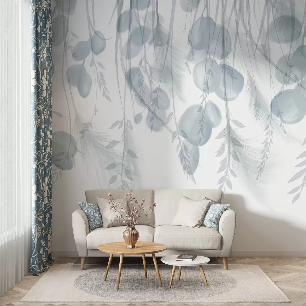 Carta da parati Delicate foglie di eucalipto grigie e verde pastello che cadono, creando un'atmosfera serena e rilassante nr. w08380