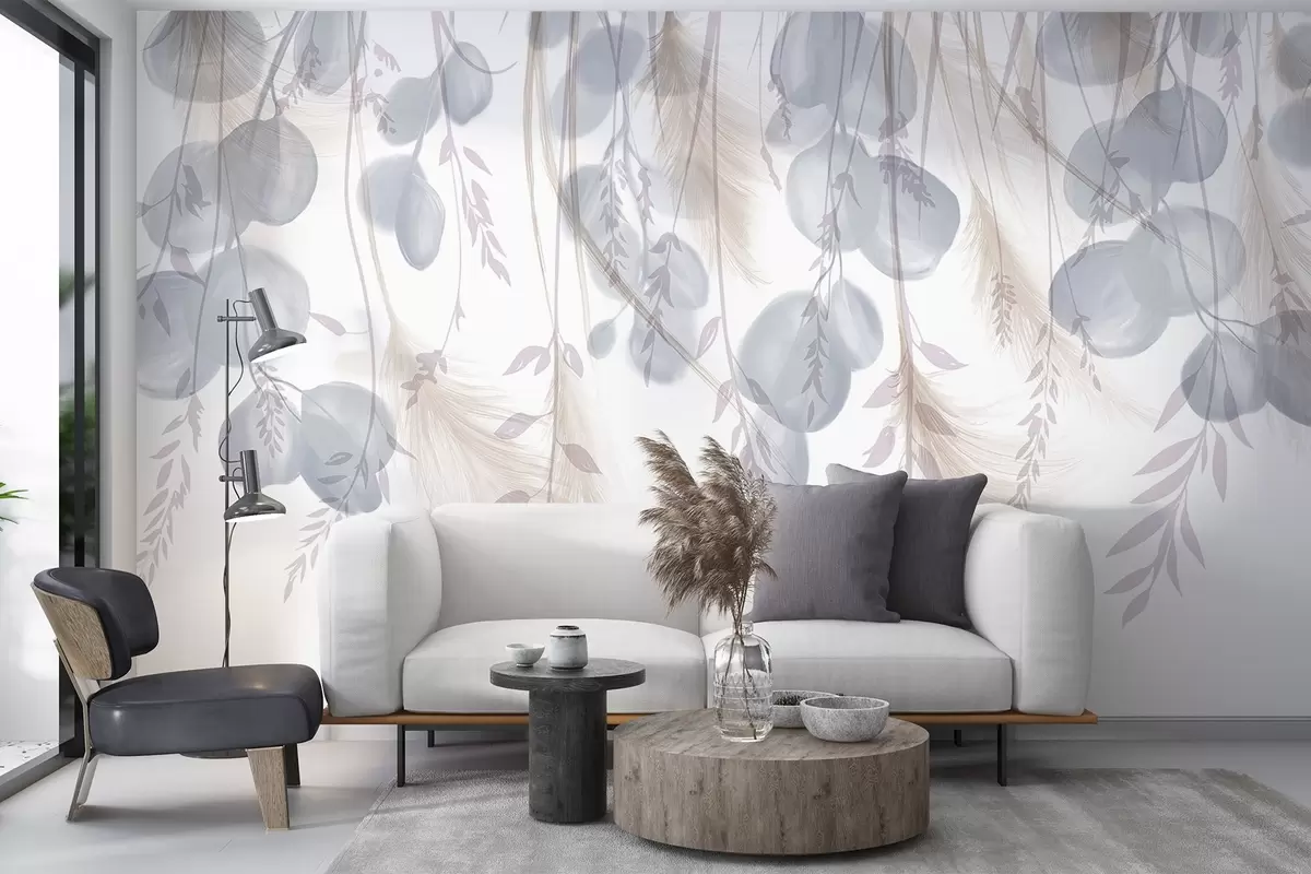 Carta da parati Delicate foglie di eucalipto blu e beige pastello che cadono, creando un'atmosfera serena e rilassante nr. w08380v1