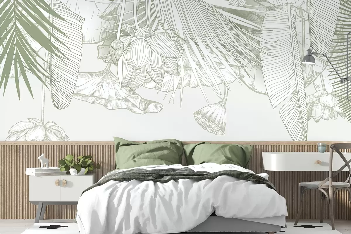 Carta da parati Una vista ravvicinata di una stampa floreale verde con grandi petali e foglie sovrapposte in un colore monocromatico nr. w08389v1
