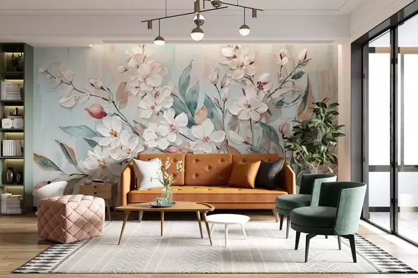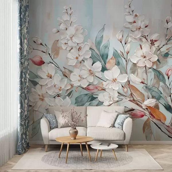 Carta da parati Fiori bianchi pastello con centro rosa, circondati da foglie e rami verdi nr. w08399