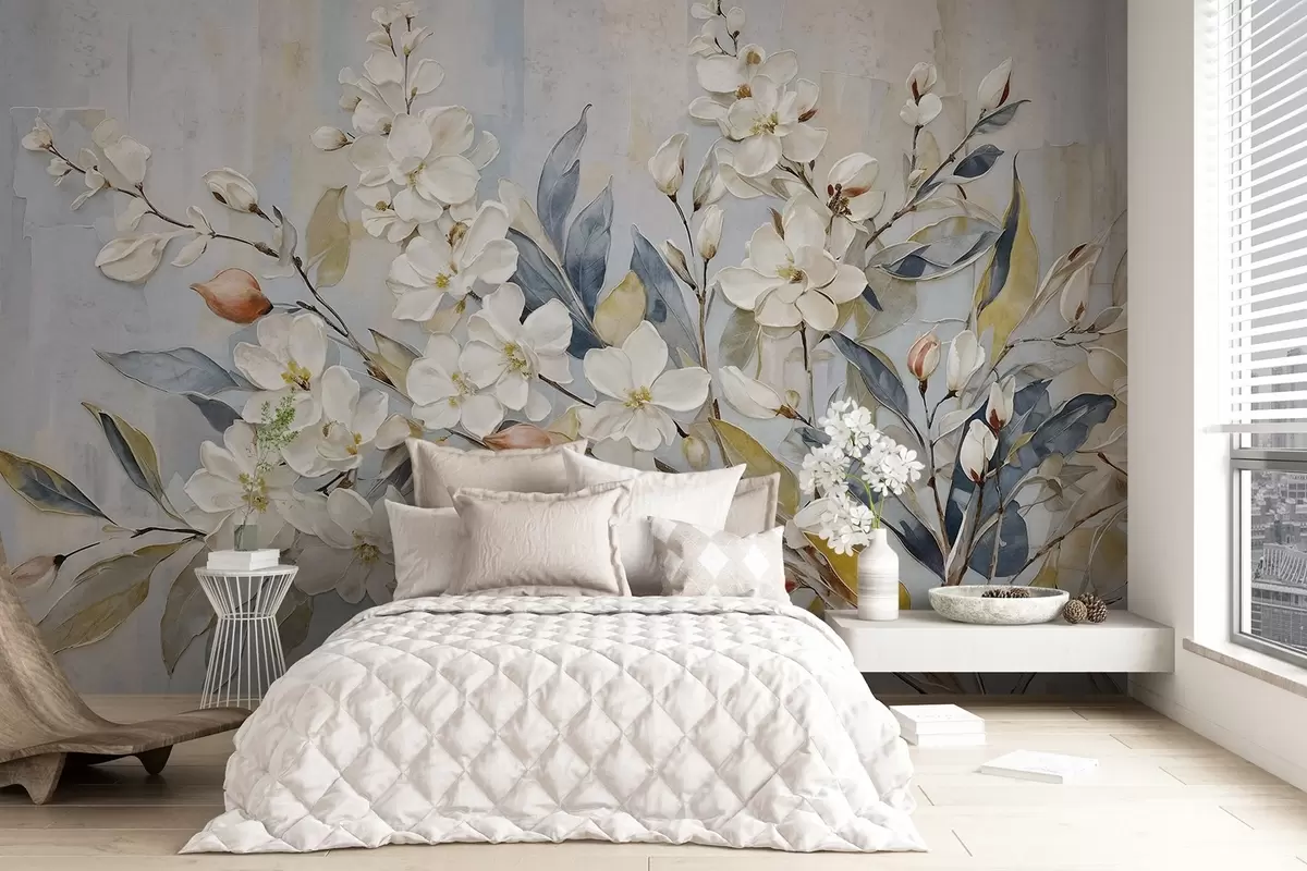Carta da parati Fiori bianchi pastello con centro giallo, circondati da foglie e rami verdi nr. w08399v1