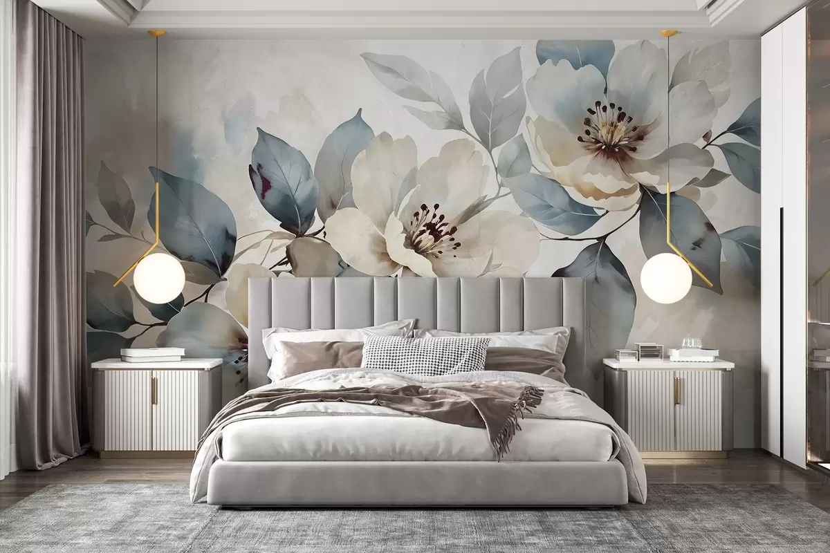 Carta da parati Delicata composizione floreale acquerellata bianca e blu, con petali e centri morbidi nr. w08401