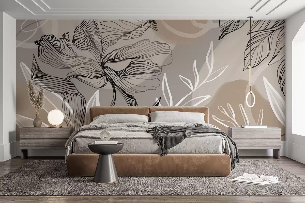 Carta da parati Elegante stampa floreale con grandi fiori e foglie dalla linea astratta nei toni del grigio e del beige su sfondo chiaro nr. w08413