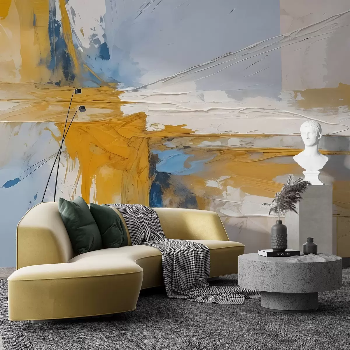 Carta da parati Composizione d'arte astratta minimalista con audaci pennellate di vernice gialla, blu e bianca nr. w08414