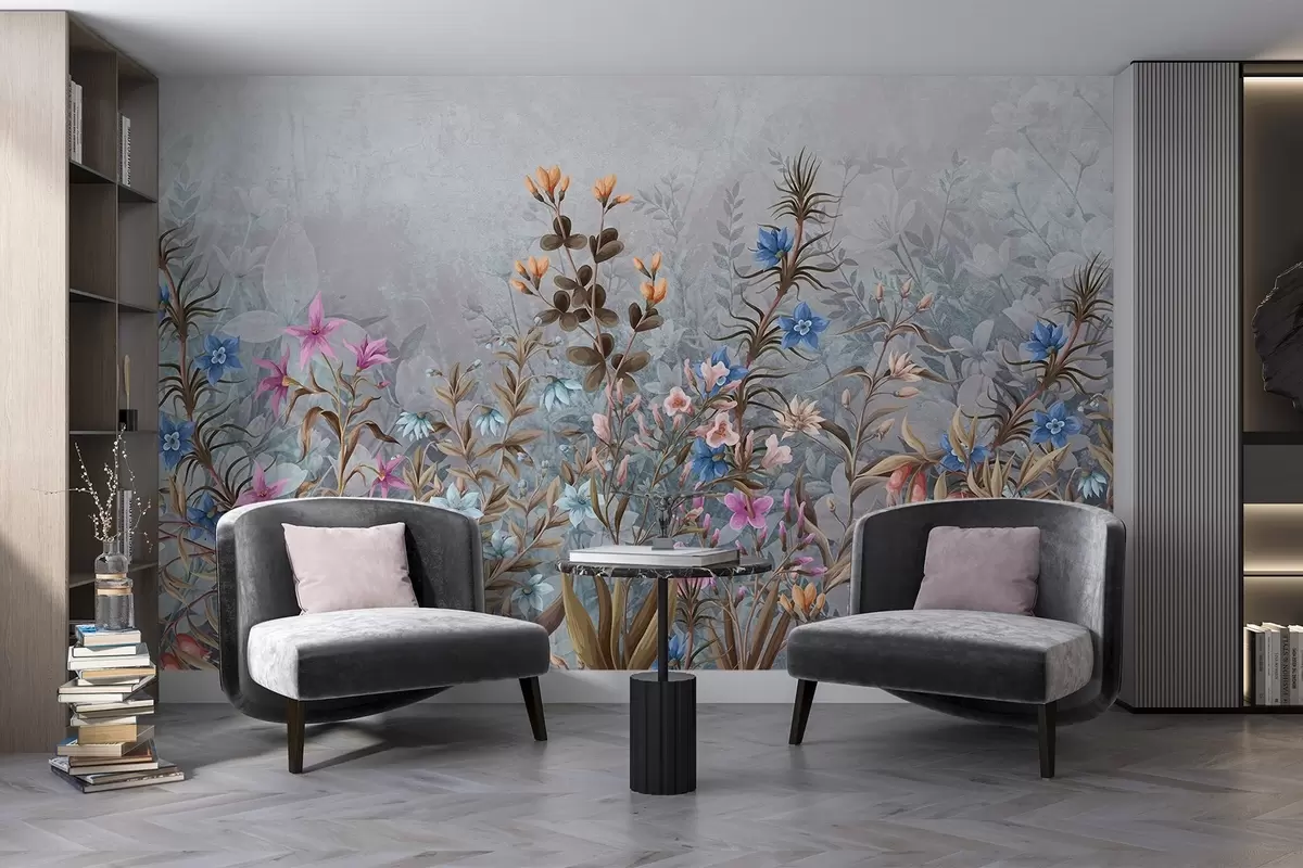 Carta da parati Una lussureggiante e vibrante stampa floreale con fiori e piante colorate dai dettagli e dalle trame intricate nr. w08428