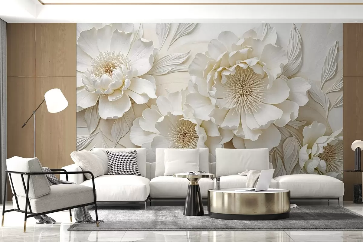 Carta da parati Elegante e voluminosa imitazione di fiori di peonia bianchi con petali morbidi e centri giallo pastello, su uno sfondo chiaro nr. w08431