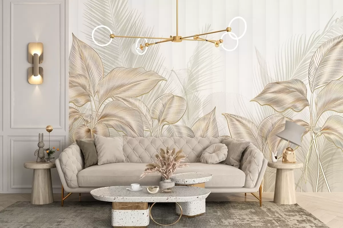 Carta da parati Eleganti foglie di palma bianche e beige su uno sfondo chiaro e strutturato nr. w08434