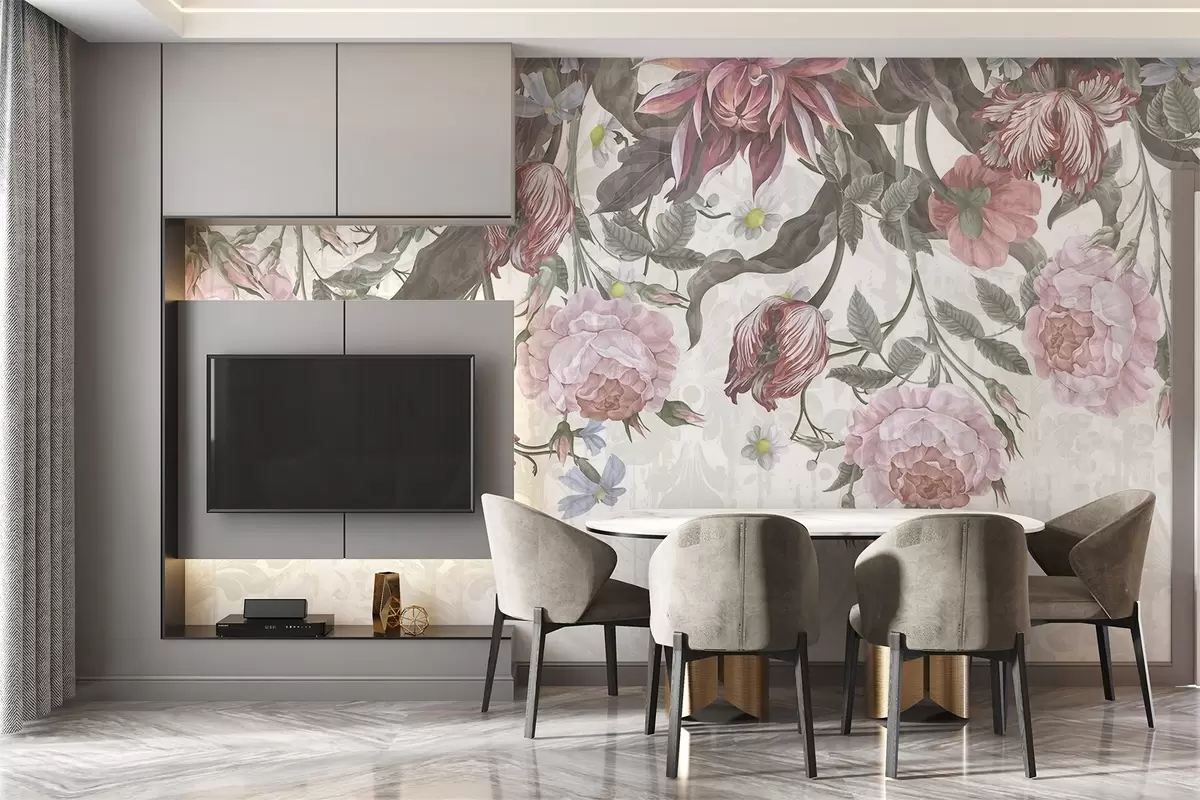 Carta da parati Una composizione floreale lussureggiante con grandi fiori bianchi e rosa, foglie e steli verdi nr. w08435
