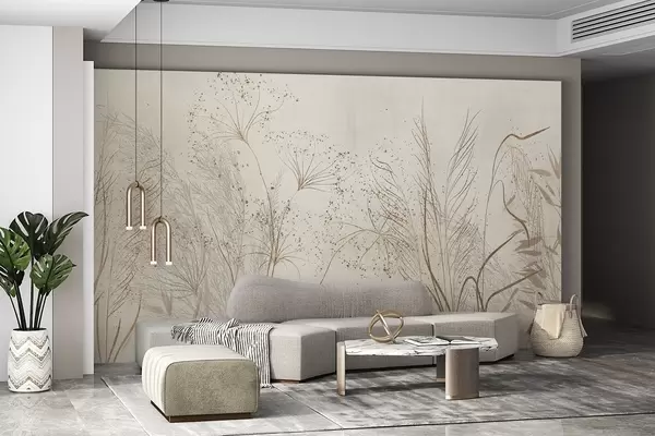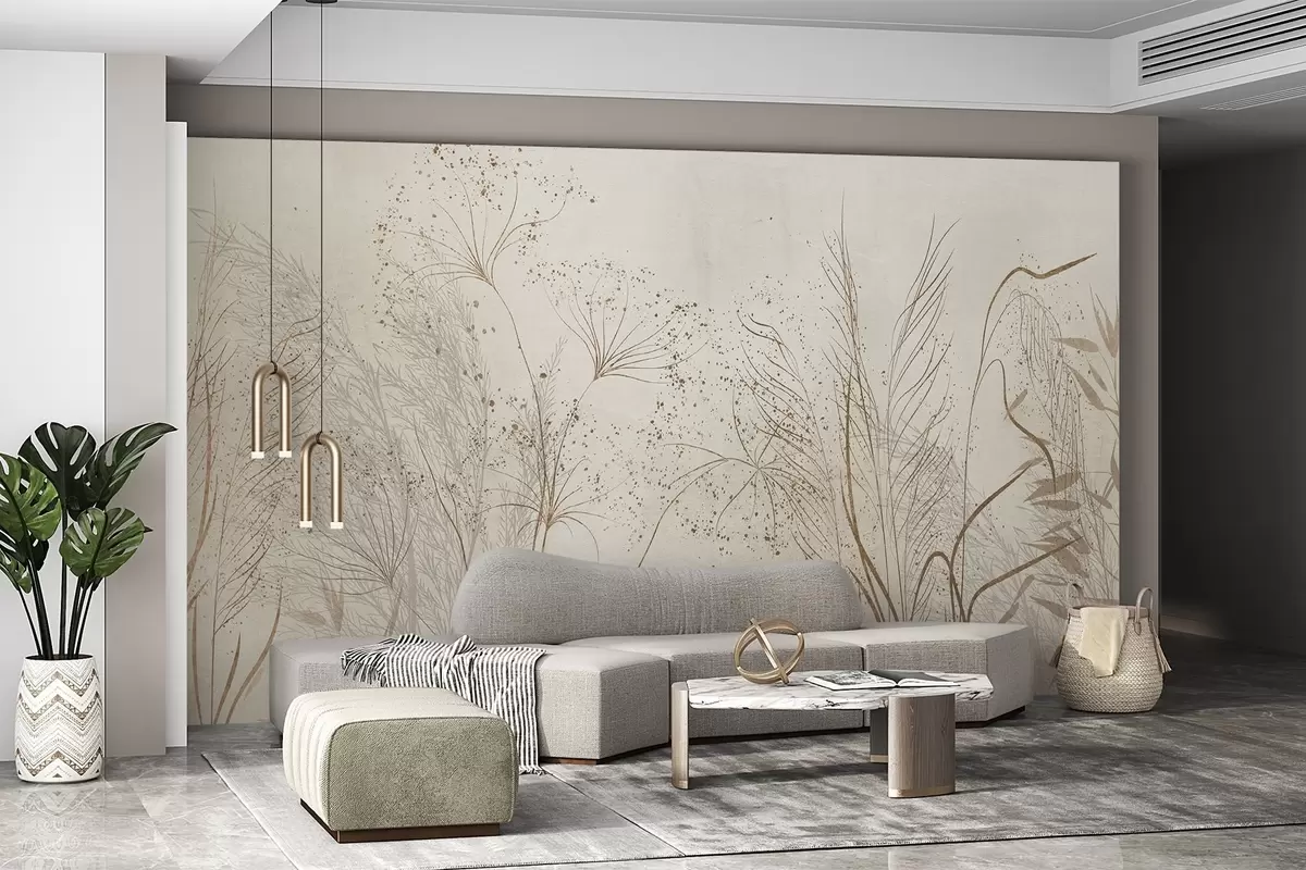 Carta da parati Illustrazione monocromatica di varie piante e spighette beige con linee e texture delicate e filiformi nr. w08441