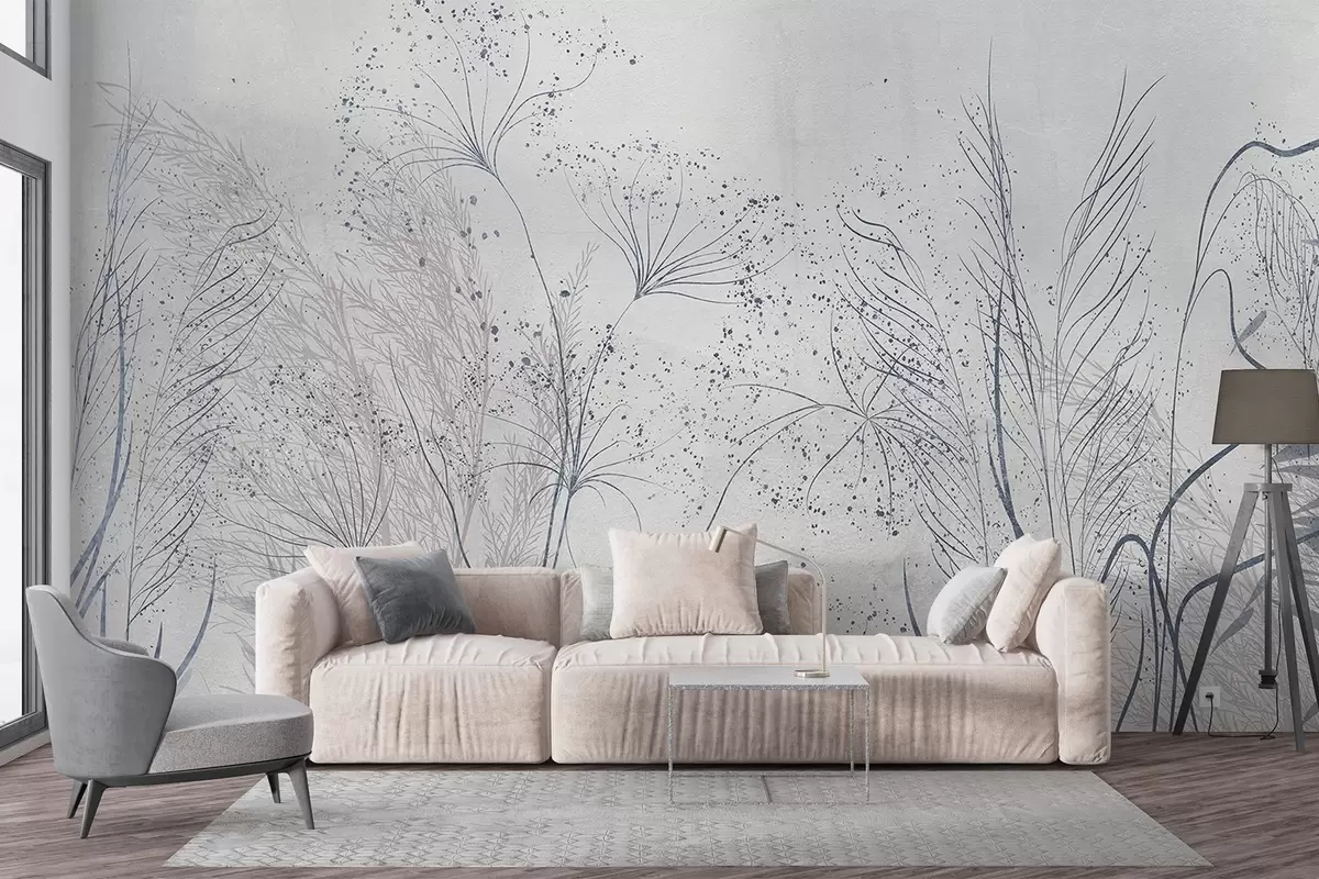 Carta da parati Illustrazione monocromatica di varie piante e spighe grigie con linee e texture delicate e filiformi nr. w08441v1