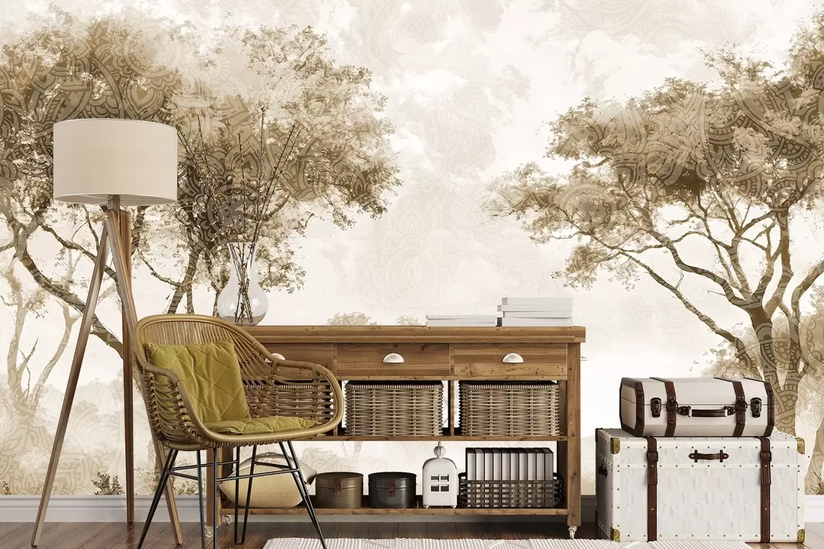 Carta da parati Un paesaggio nebbioso e sereno con alberi in primo piano e una nebbia soffice nei toni del marrone e del beige nr. w08442v2