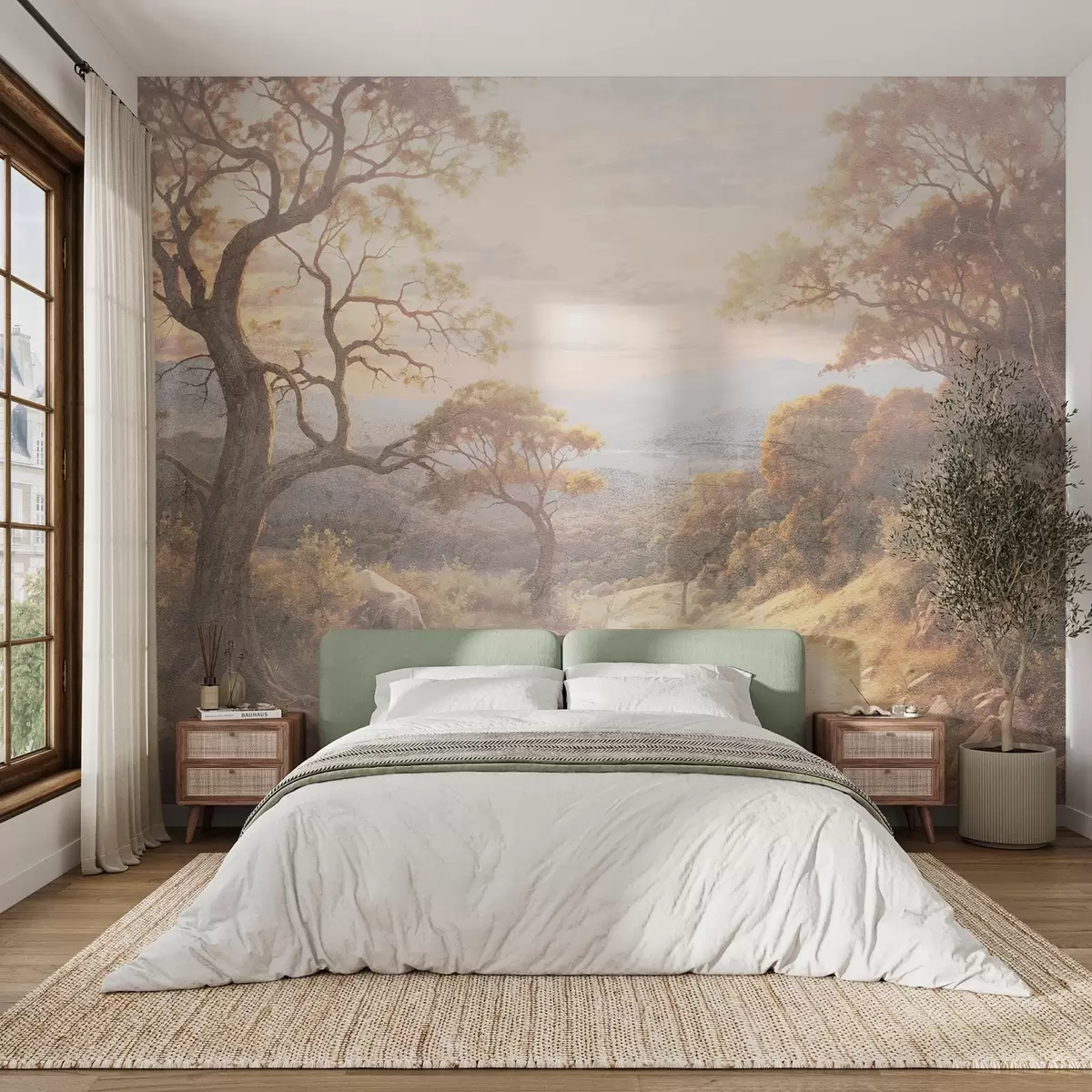 Carta da parati Un tortuoso sentiero sterrato attraverso una lussureggiante foresta autunnale con alberi alti e contorti e una calda luce del sole nr. w08446