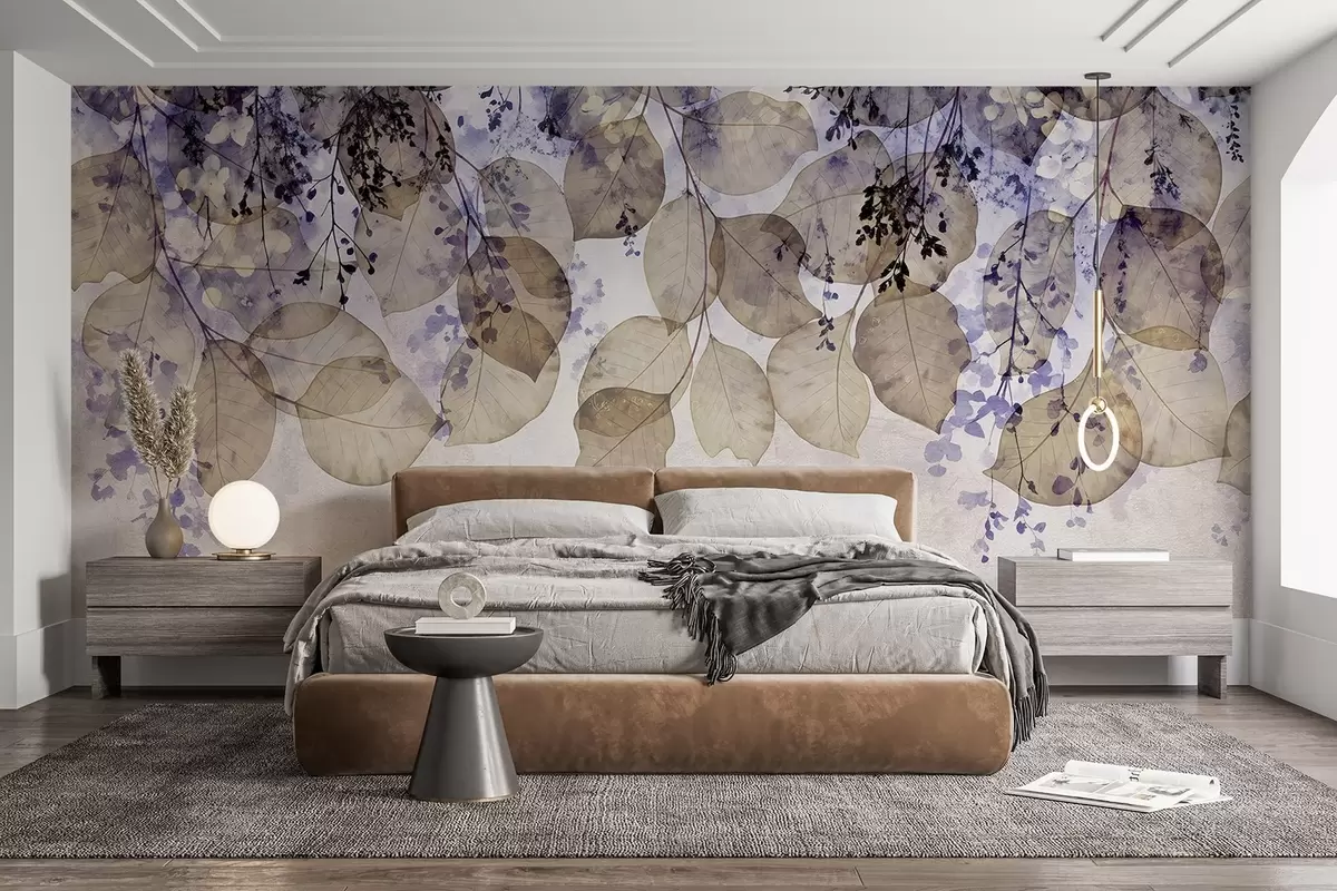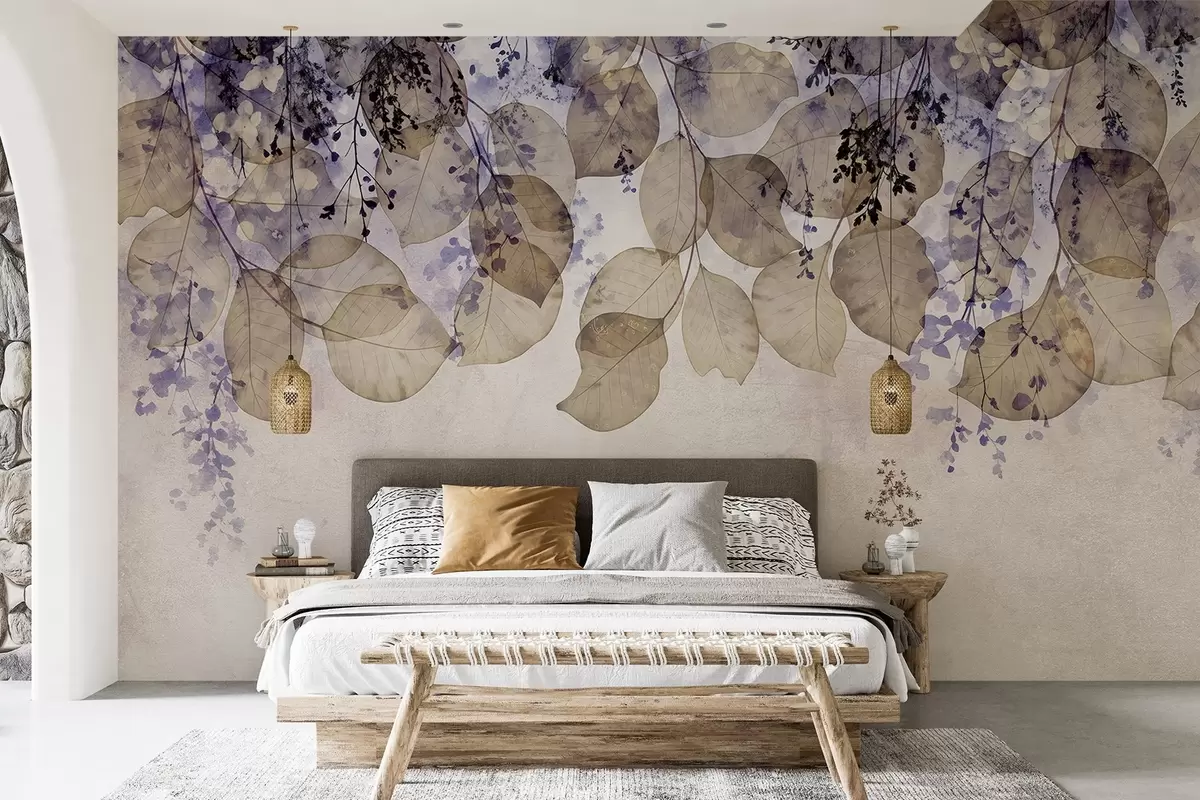 Carta da parati Delicate foglie secche e fiori nei toni del viola, del beige e del bianco su uno sfondo dalla texture leggera nr. w08447