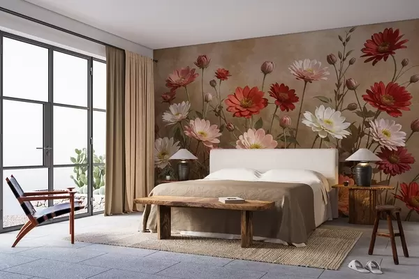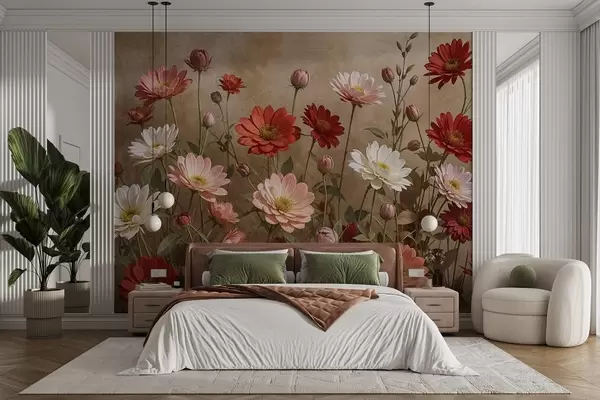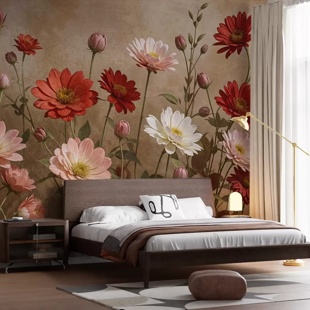 Carta da parati Un campo di fiori colorati a forma di margherita in varie tonalità di rosa, rosso e bianco su uno sfondo strutturato nr. w08462