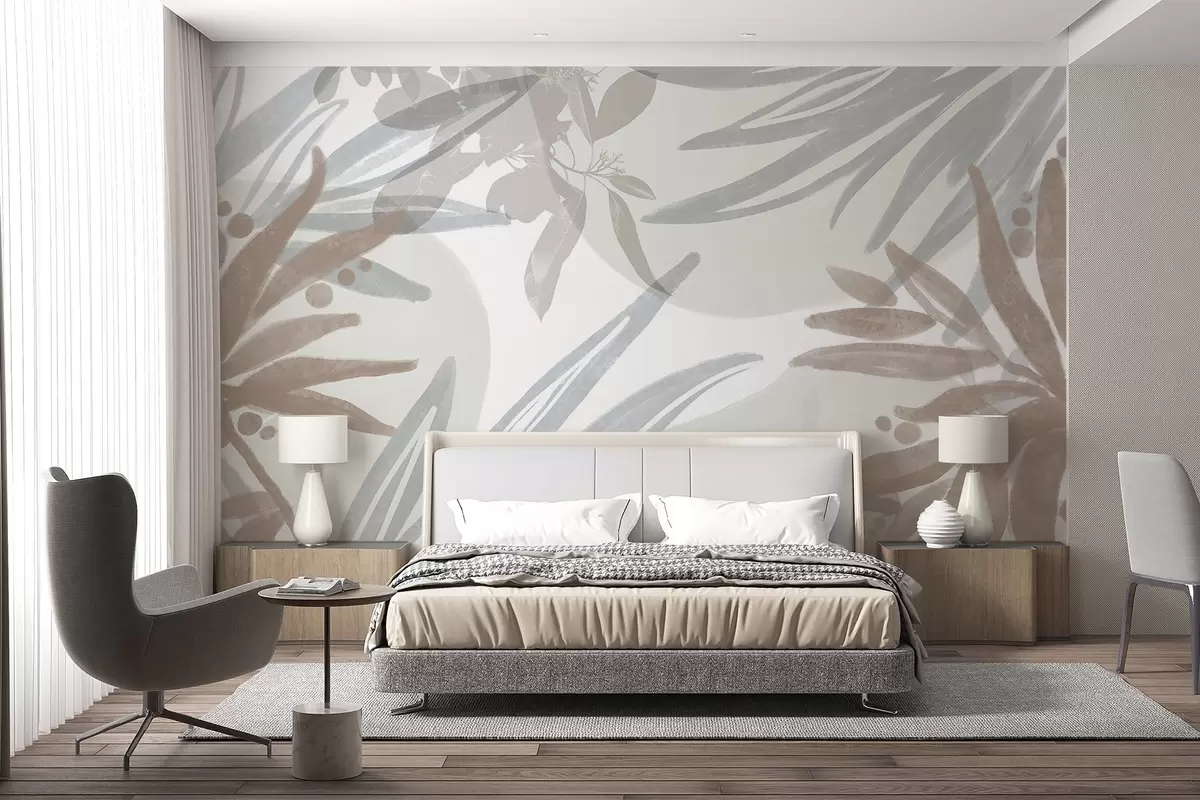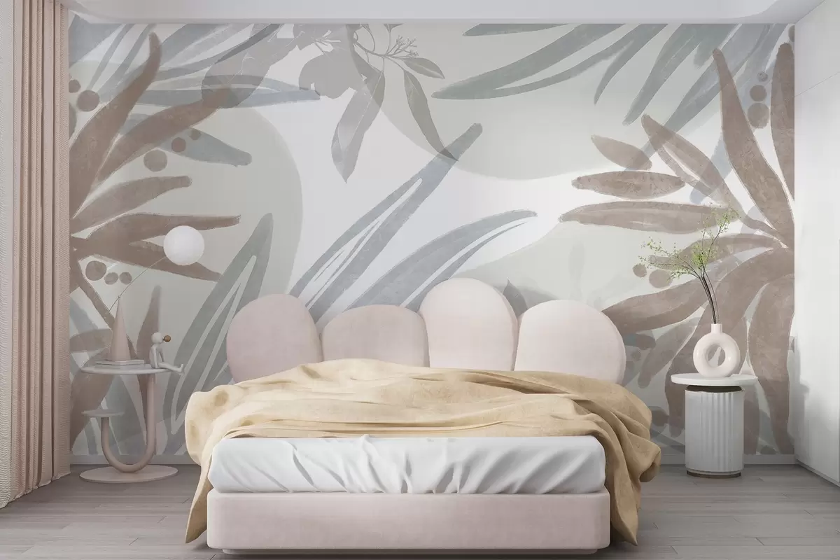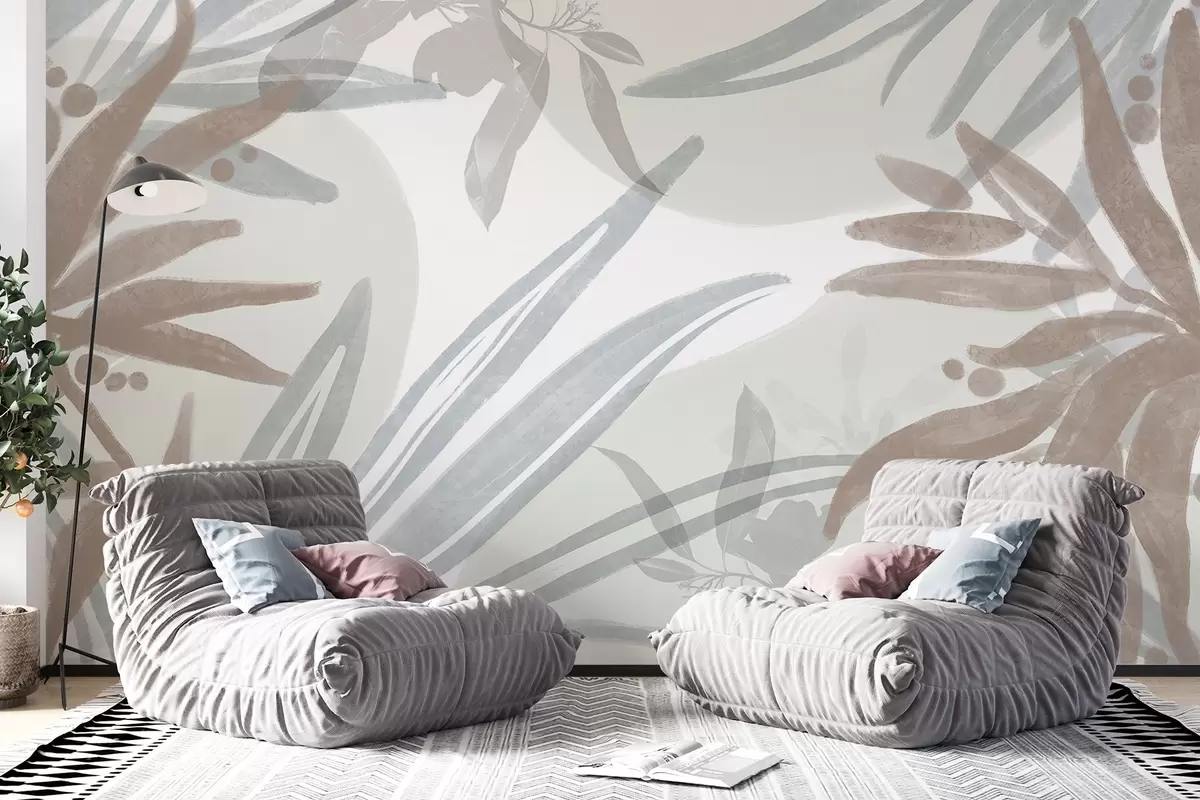 Carta da parati Un motivo floreale astratto dai toni neutri con foglie e forme sovrapposte nei toni del grigio, del bianco e del beige nr. w08464