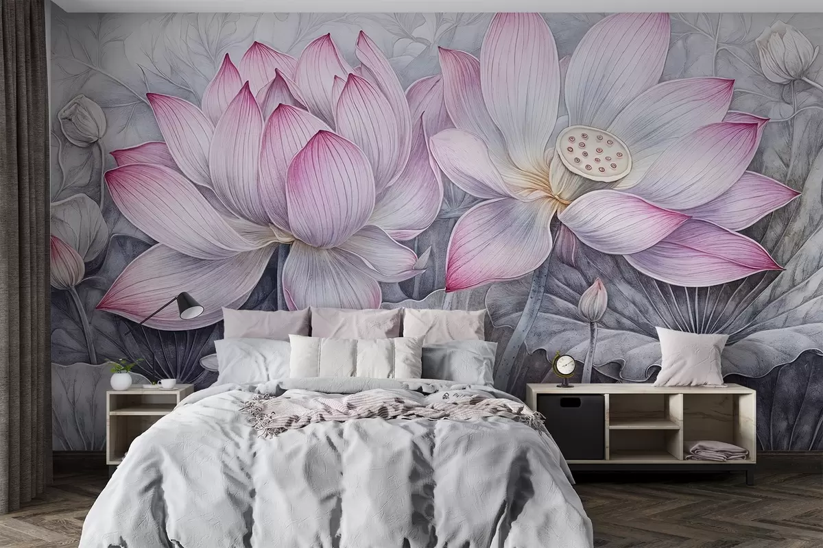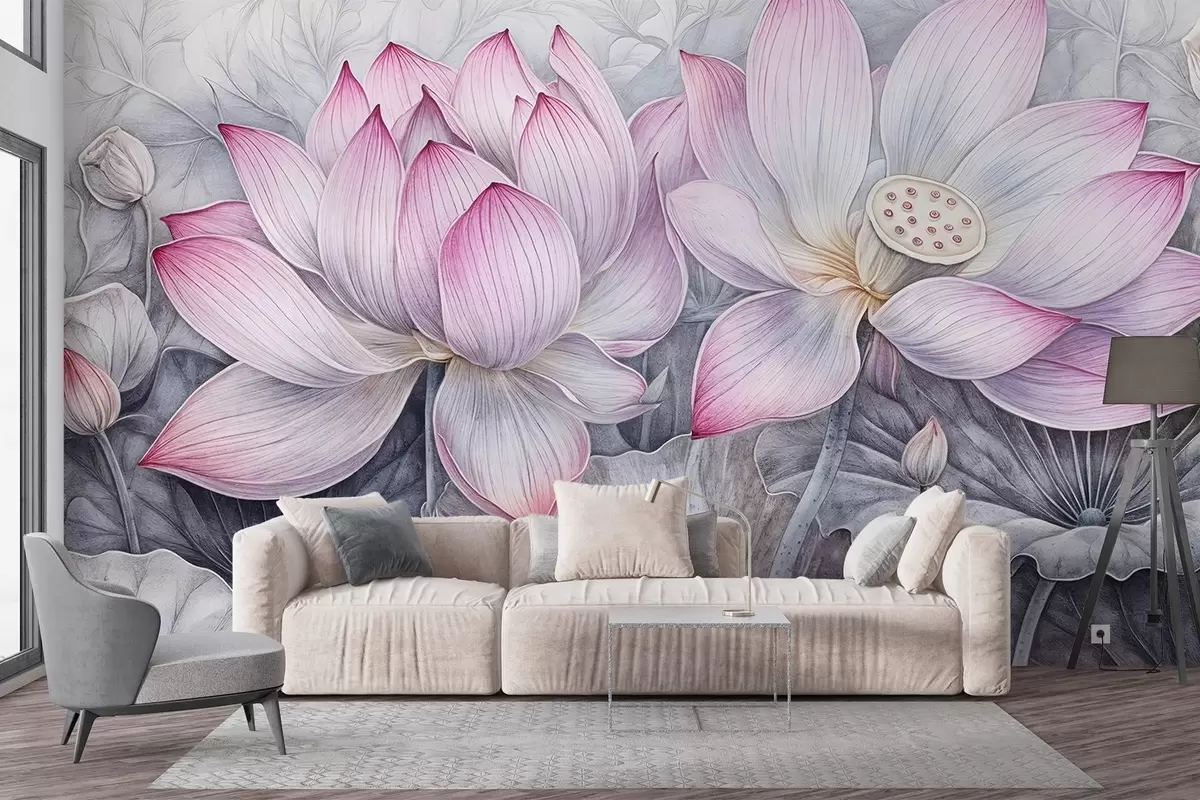 Carta da parati Diversi fiori di loto rosa di grandi dimensioni, con foglie e steli grigio-verdi, su uno sfondo chiaro nr. w08465