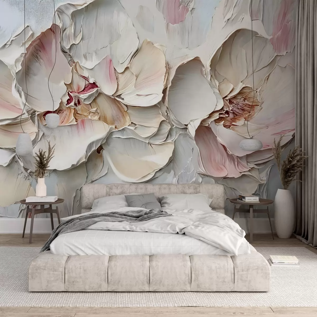 Carta da parati Delicati fiori rosa pallido con petali morbidi e stratificati su uno sfondo tenue e strutturato imitazione di pittura a olio a impasto nr. w08467