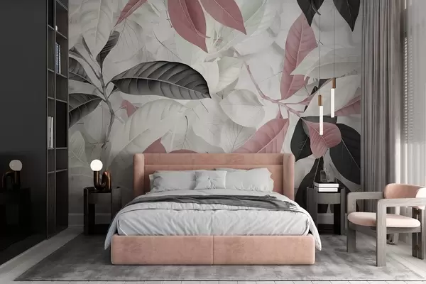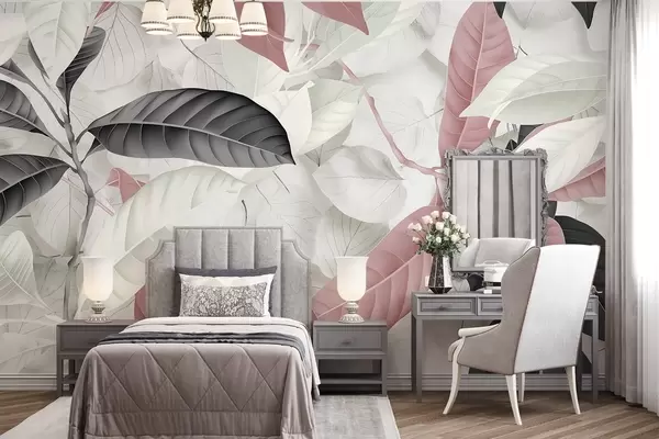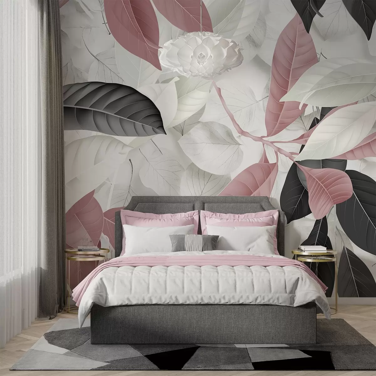 Carta da parati Stampa di grandi dimensioni di foglie rosa e grigie su uno sfondo con texture di foglie chiare, che crea un'atmosfera tropicale lussureggiante nr. w08468