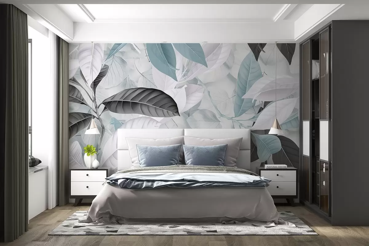 Carta da parati Stampa di grandi dimensioni di foglie blu e grigie su uno sfondo con texture di foglie chiare, che crea un'atmosfera tropicale lussureggiante nr. w08468v1