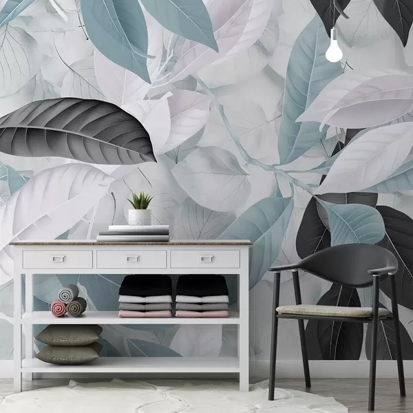 Carta da parati Stampa di grandi dimensioni di foglie blu e grigie su uno sfondo con texture di foglie chiare, che crea un'atmosfera tropicale lussureggiante nr. w08468v1