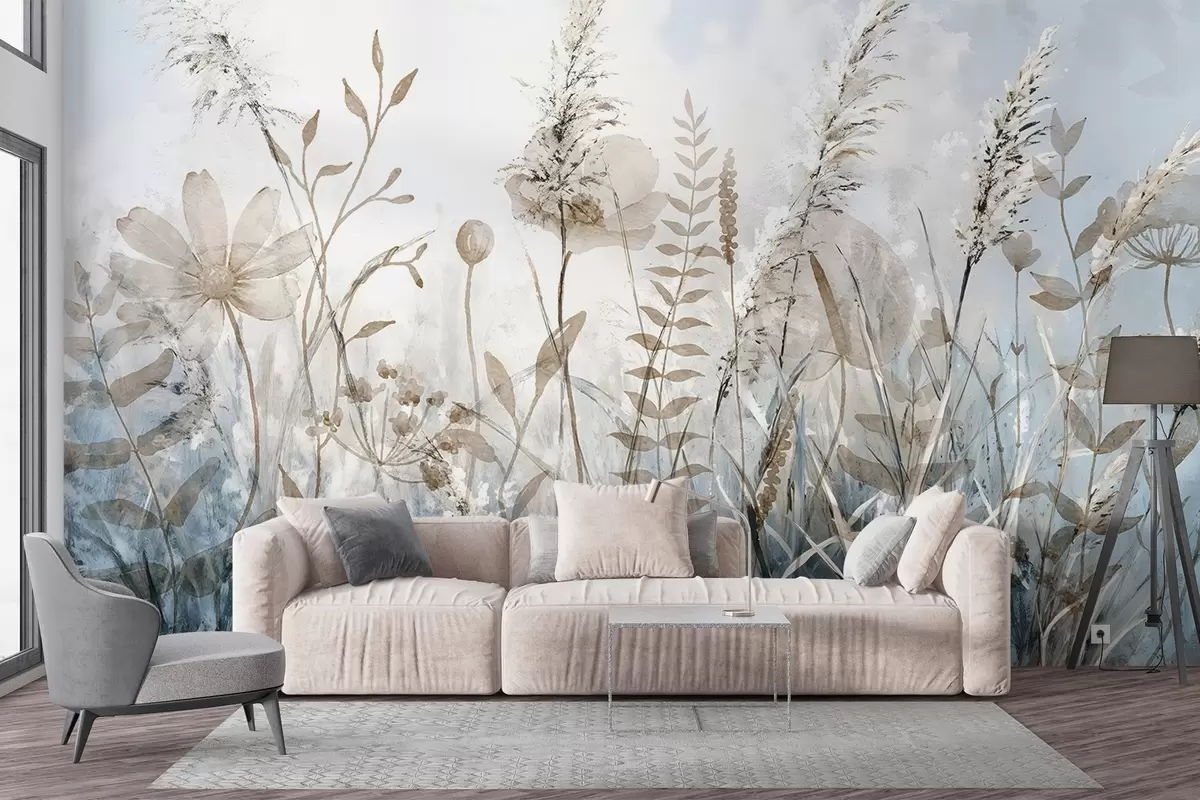 Carta da parati Un campo di erba alta, fogliame naturale e piante con texture morbide e vaporose in un cielo coperto e nebuloso nr. w08472