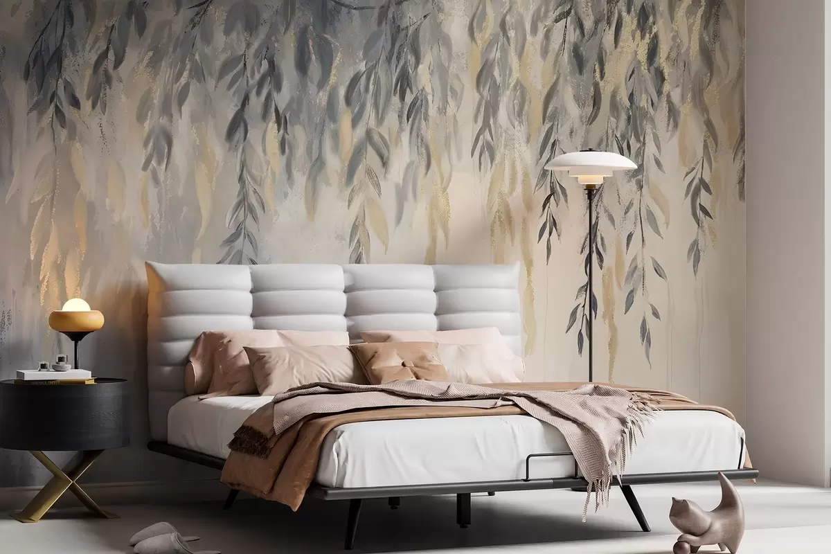 Carta da parati Rami di salice con foglie delicate pendenti su uno sfondo morbido e sfocato nr. w08473