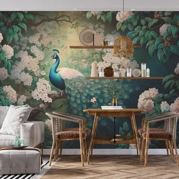 carta da parati Bellissimo pavone sui rami tra piccoli fiori nr. w08475