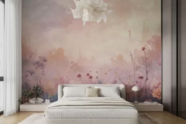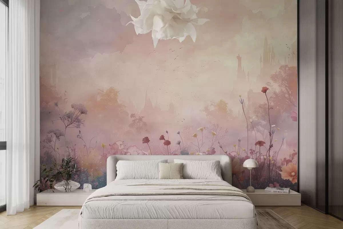 Carta da parati Fiori selvatici su sfondo di silhouette di castello nr. w08478