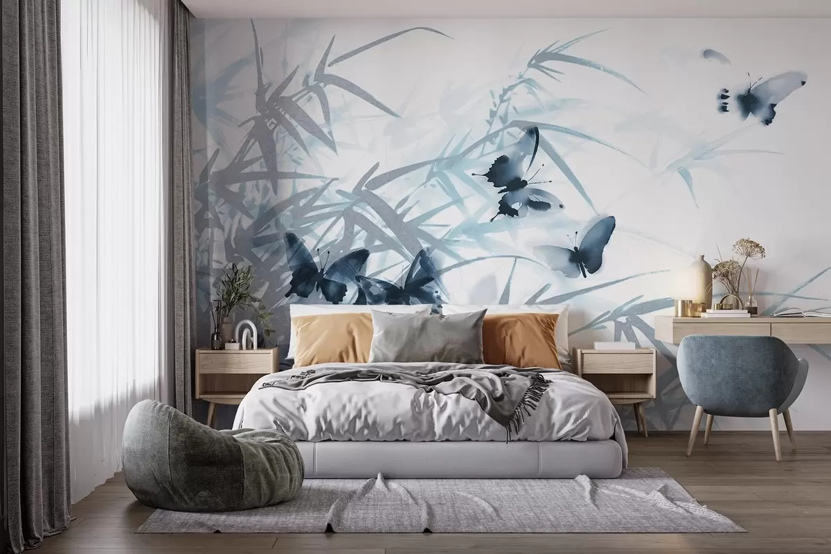 Carta da parati Foglie e steli di bambù con farfalle blu volanti con ali trasparenti nr. w08524