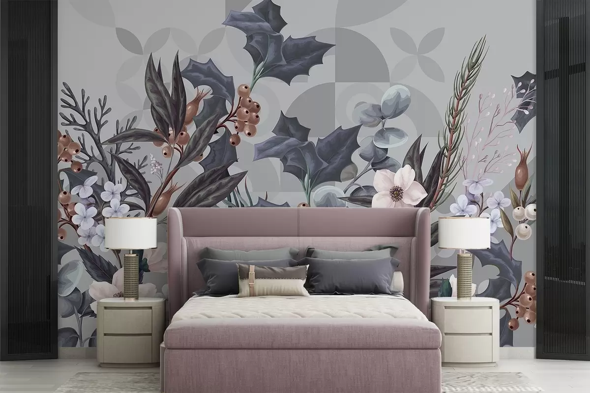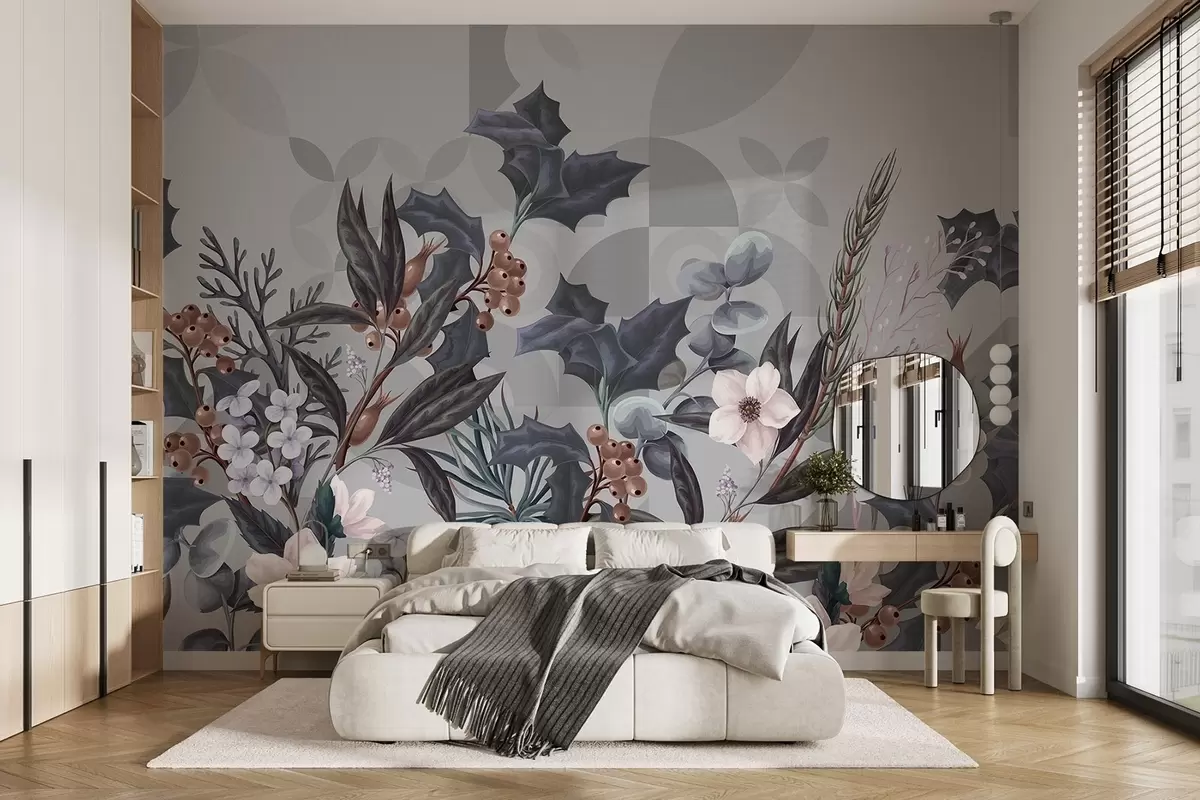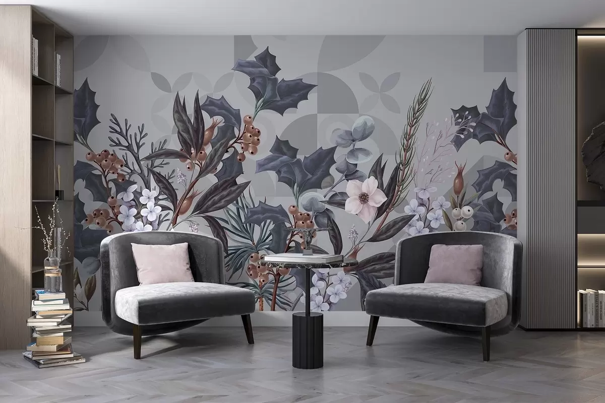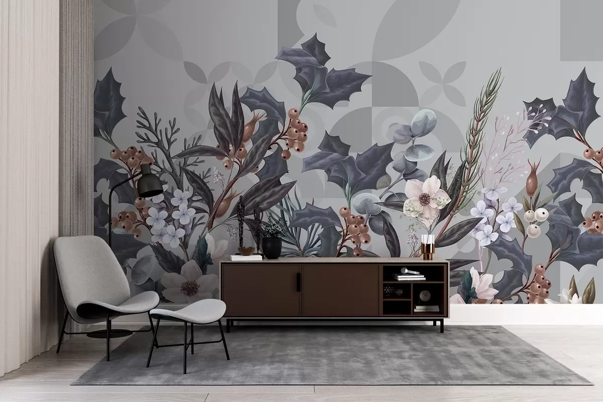 Carta da parati Composizione floreale con grandi foglie, fiori e bacche scure su uno sfondo astratto geometrico grigio tenue nr. w08525
