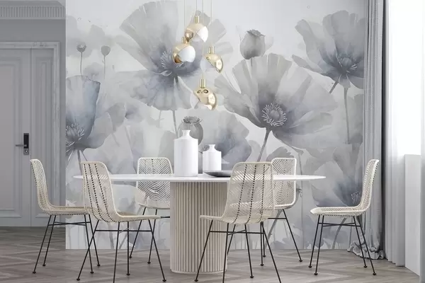 Carta da parati Delicati fiori grigi e bianchi con petali morbidi e sfocati su uno sfondo bianco nr. w08526