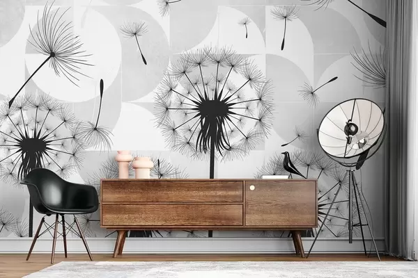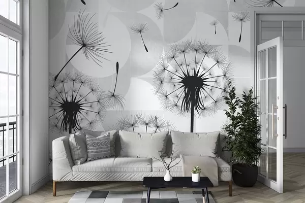 Carta da parati Fiori di dente di leone in bianco e nero con teste di semi soffici su uno sfondo testurizzato bianco e grigio chiaro nr. w08529