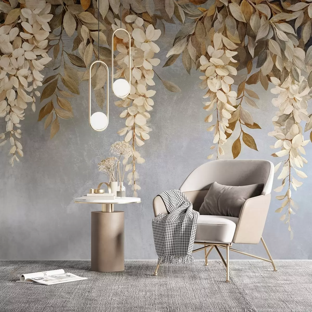 Carta da parati Delicati fiori di glicine bianchi e beige chiaro con fogliame a cascata su uno sfondo grigio tenue nr. w08531