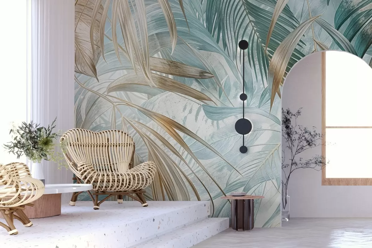 Carta da parati Una stampa floreale tropicale astratta con grandi foglie di palma nei toni del blu e del beige crea un'atmosfera lussureggiante nr. w08532