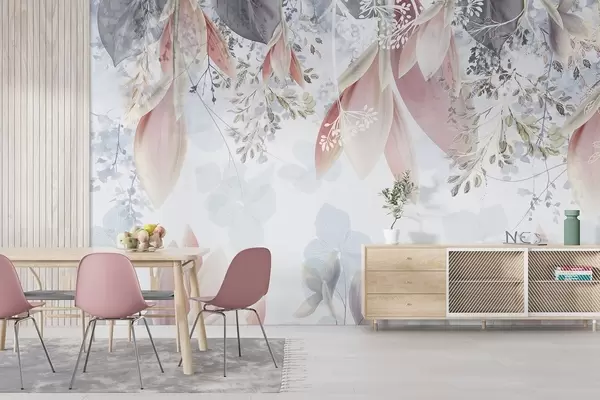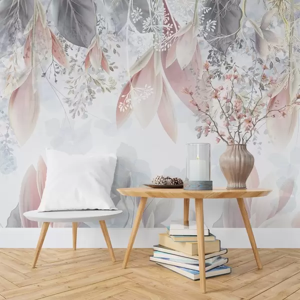 Carta da parati Morbida stampa floreale dai colori pastello con delicati petali e foglie nei toni del rosa, del bianco e del grigio nr. w08538