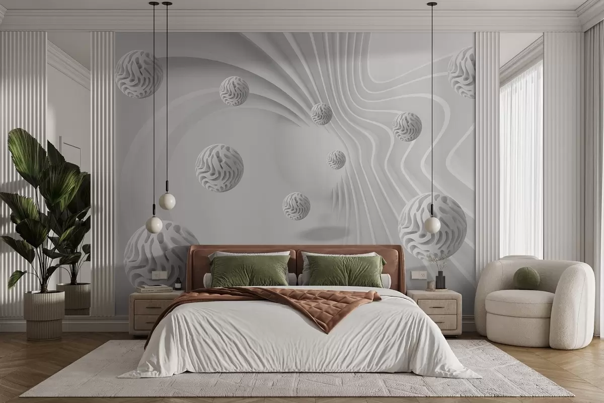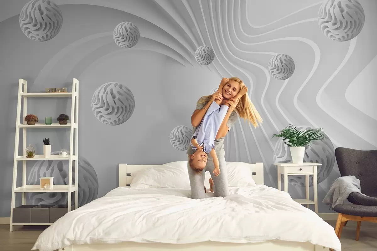 Carta da parati astrazione grigia 3D con sfere ed effetto di profondità nr. w08553