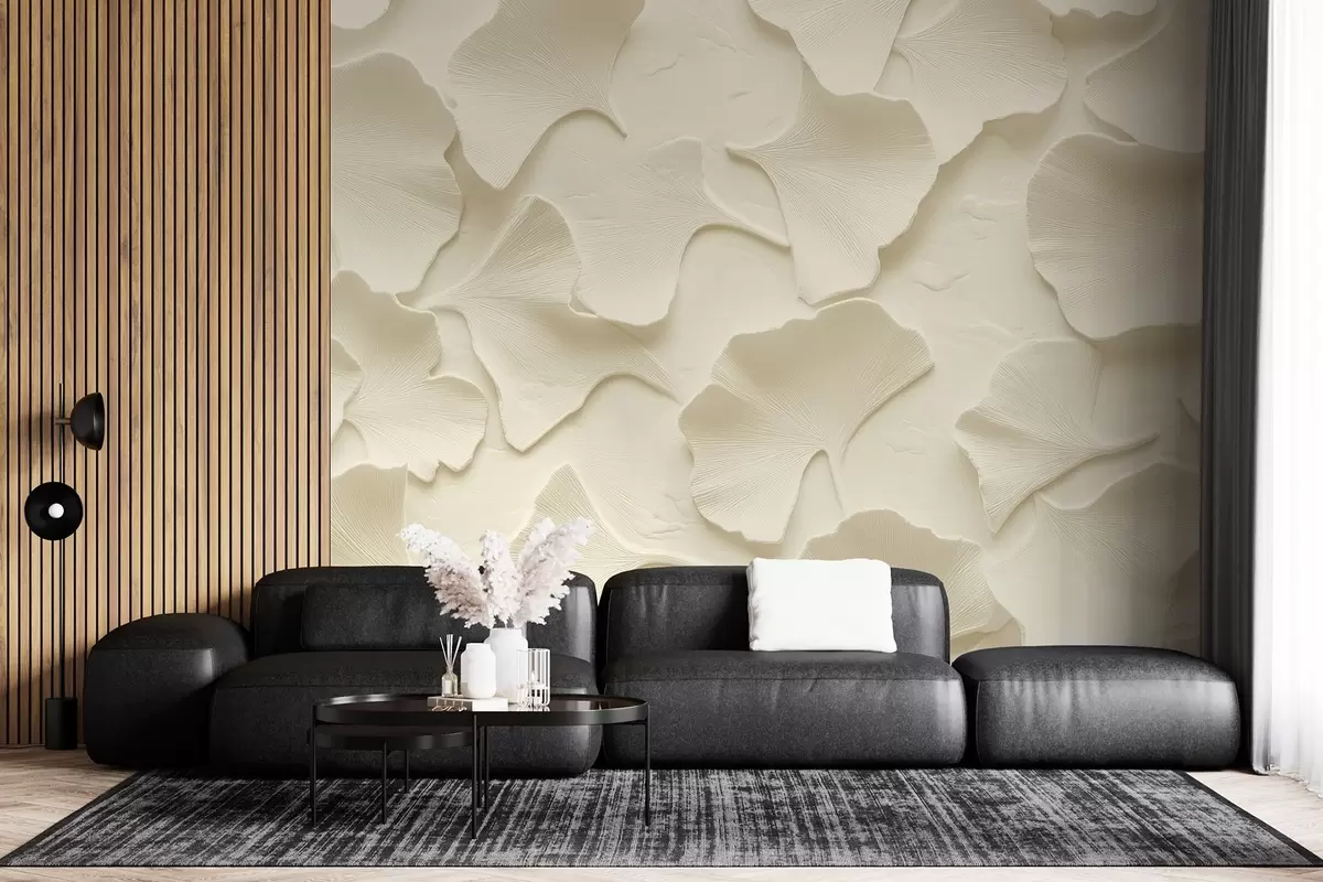 Carta da parati Stucco con delicato rilievo di foglie di ginkgo su un morbido fondo beige nr. w08560