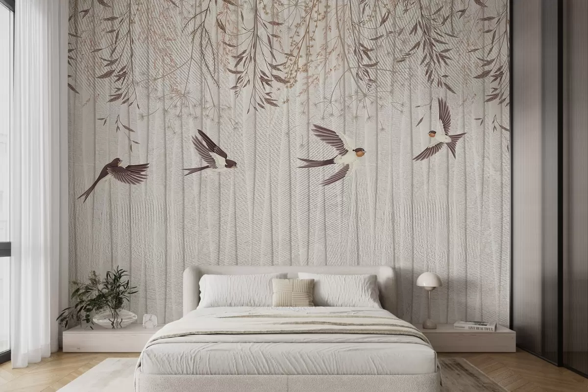 Carta da parati Uccelli in volo su uno sfondo strutturato con denti di leone e fiori nr. w08566