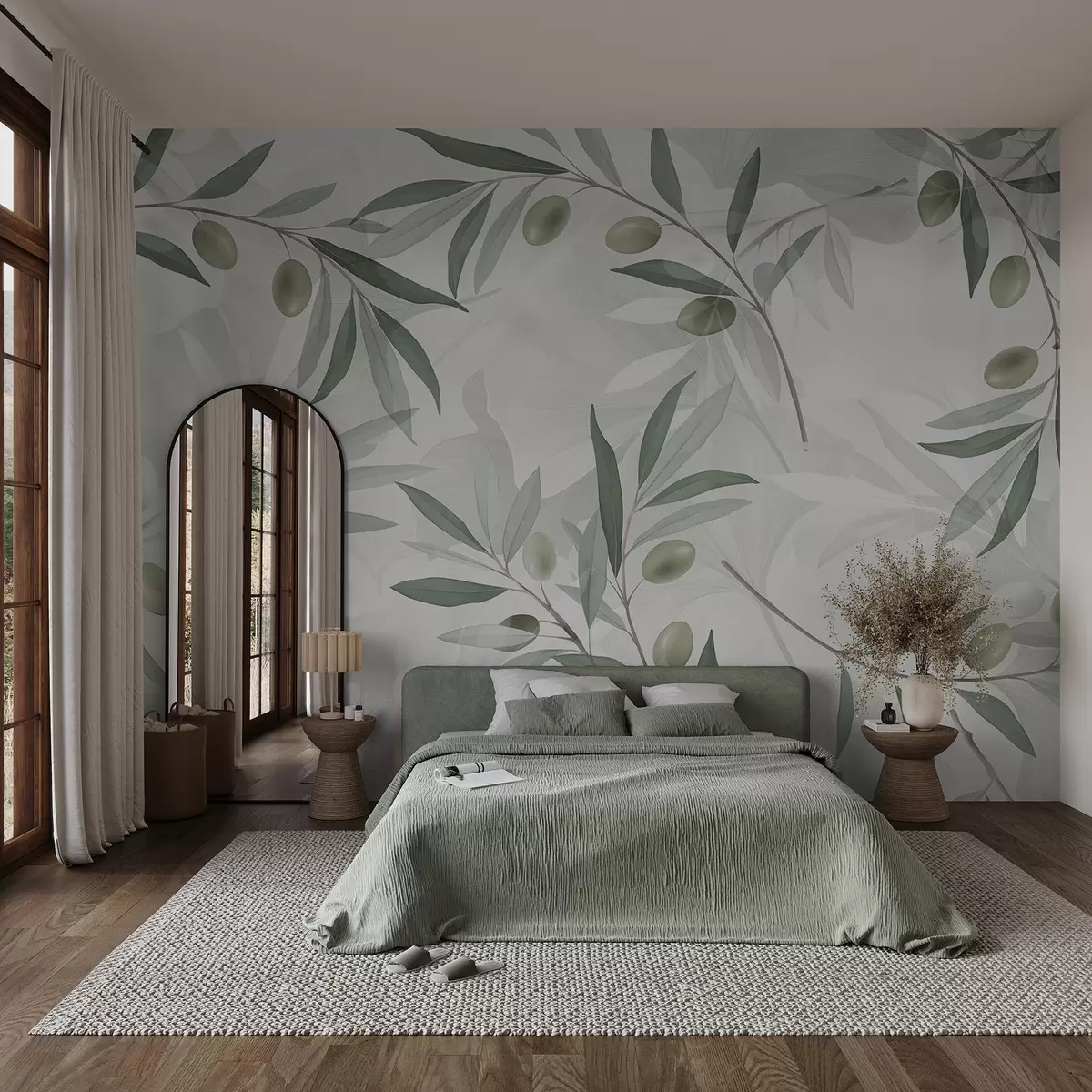 Carta da parati Rami di ulivo con foglie verdi e olive su sfondo chiaro nr. w08576
