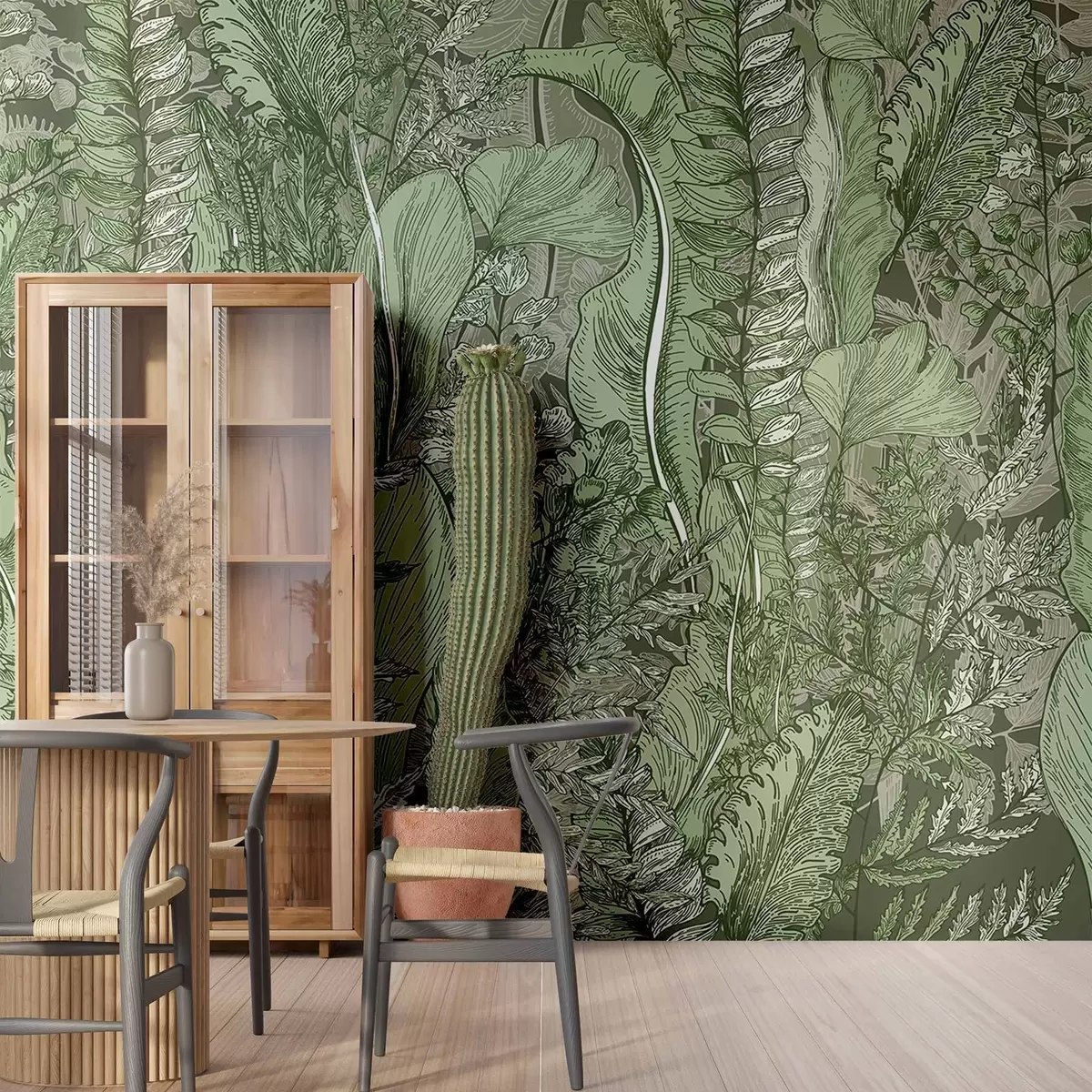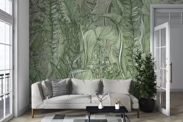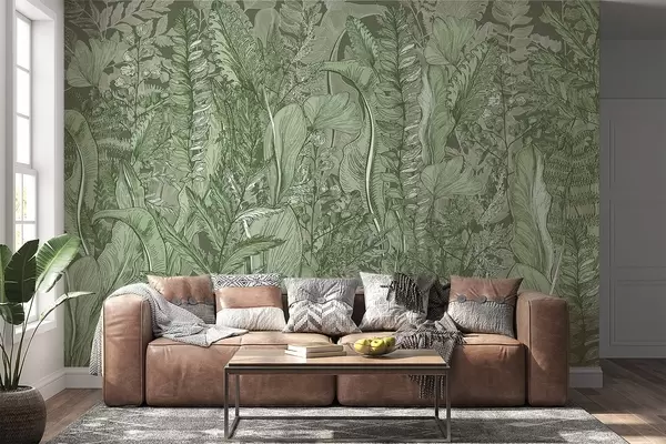 Carta da parati Una foresta rigogliosa e verdeggiante con vari tipi di felci, foglie e fogliame nelle tonalità del verde nr. w08579