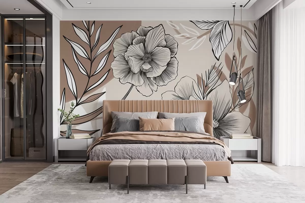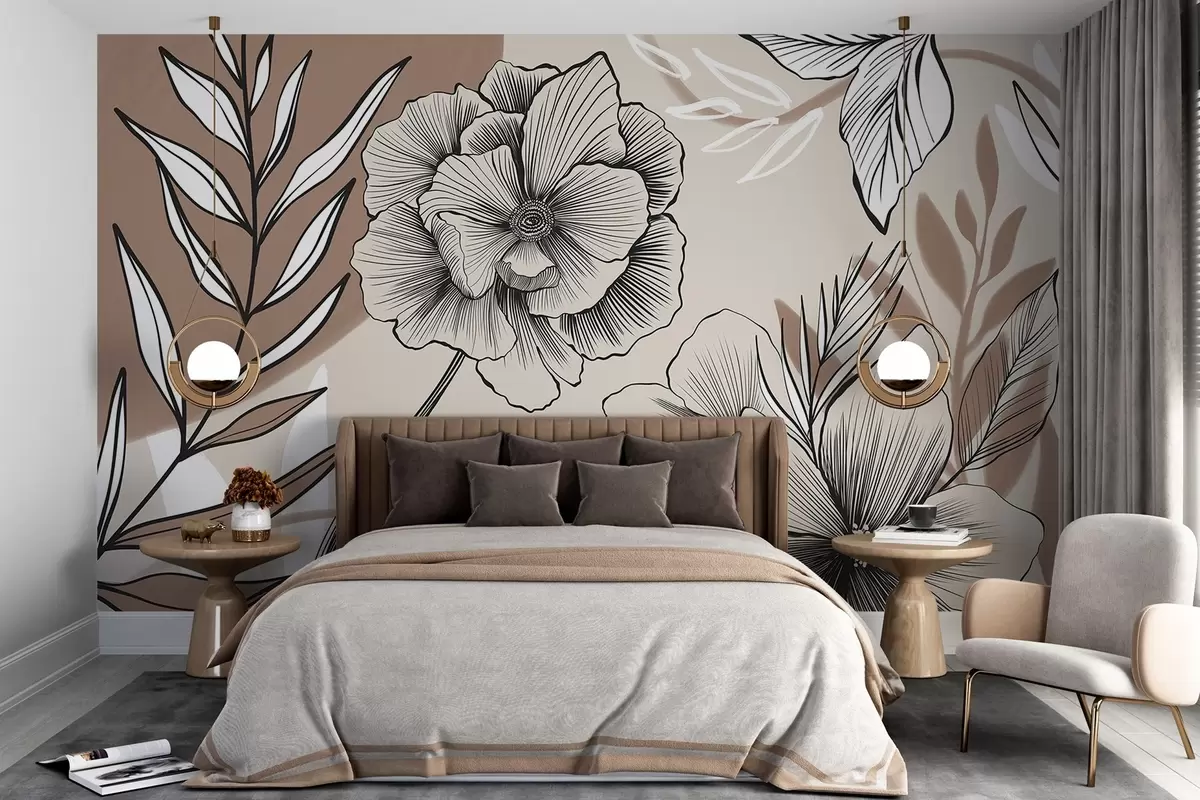 Carta da parati Grandi fiori grafici in bianco e nero con foglie dettagliate su uno sfondo astratto beige nr. w08580